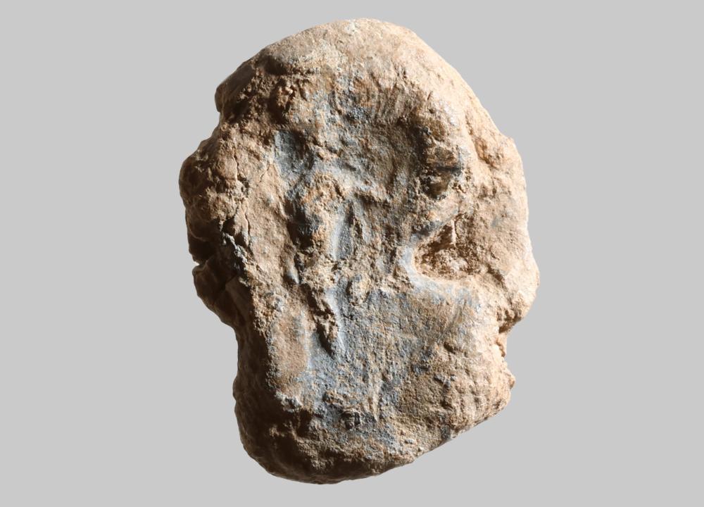 Flache ovale Plombe mit ovalem Stempel. Männliche Figur im Profil nach rechts, Kopf mit breitkrempigen Hut oder Helm bedeckt. Rechter Arm angewinkelt und vor sich erhoben, Schild oder Bogen haltend. Umrisse kaum erkennbar. Rückseite uneben. Waagrechte Durchlochung durch Schnurführung.