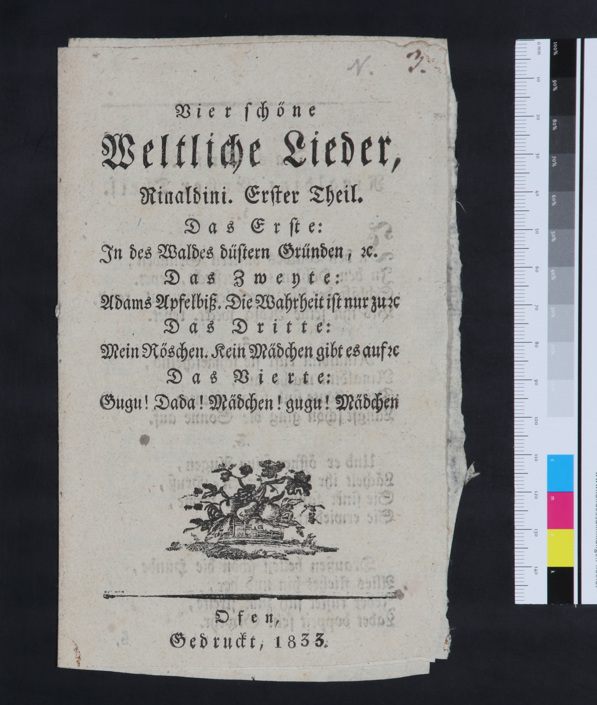 Achtseitiges Heft mit 4 verschiedenen Liedern; 1. Seite unten Mitte fünftelseitiger Holzschnitt eines Obstkorbes ?; 8. Seite unten Mitte fünftelseitiger Holzschnitt Zierelemte.