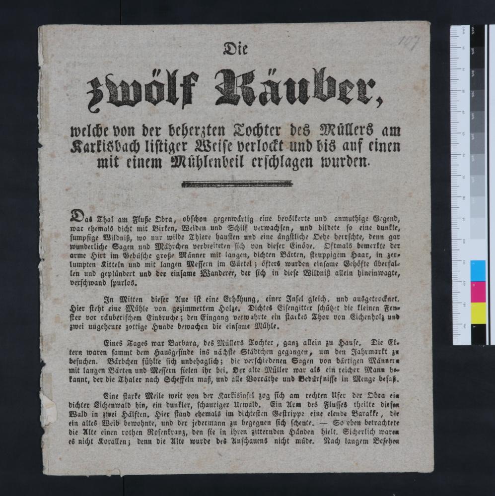 „Die zwölf Räuber, welche von der behertzen Tochter des Müllers am Karkisbach listiger Weise verlockt und bis auf einen mit einem Mühlenbeil erschlagen wurden.“