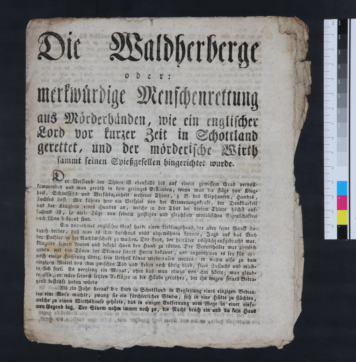 „Die Waldherberge oder: merkwuerdige Menschenrettung aus Moerderhaenden, wie ein englischer Lord vor kurzer Zeit in Schottland gerettet, und der moerderische Wirth sammt seinen Spießgesellen hingerichtet wurde.“