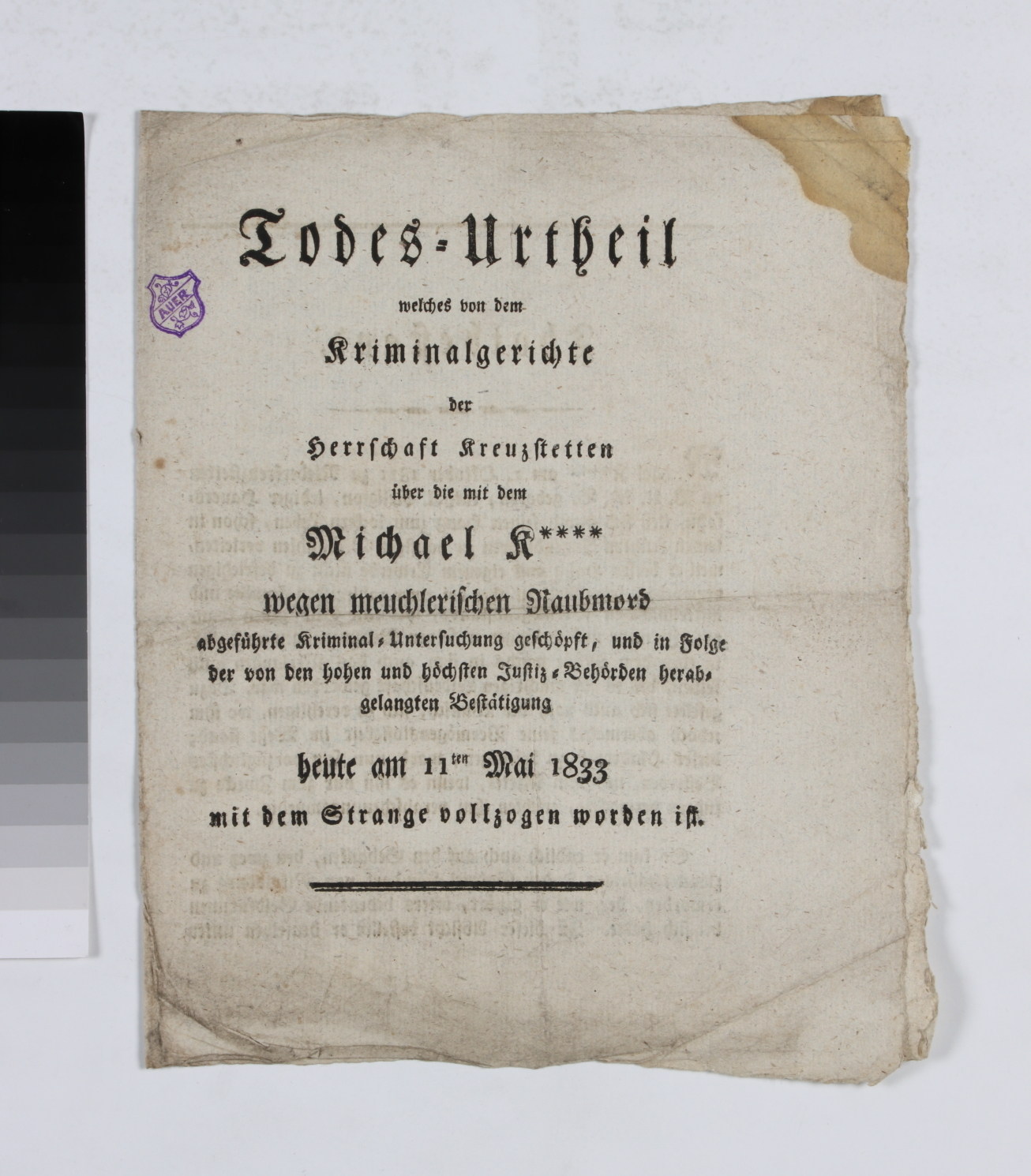 „Todes = Urtheil welches von dem Kriminalgerichte der Herrschaft Kreuzstetten über die mit dem Michael K**** wegen meuchlerischen Raubmord abgeführte Kriminal=Untersuchung geschöpft, und in Folge der von den hohen und höchsten Justiz=Behörden herabgelangten Bestätigung heute am 11ten Mai 1833 mit dem Strange vollzogen worden ist.“