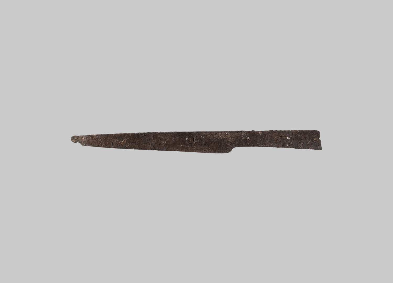 Messer mit geradem Rücken, fragmentierter Klinge mit zwei Punzen und abgebrochenem Griff mit zwei Nietlöchern in der einseitigen Leiste. Die Spitze ist abgebrochen.
