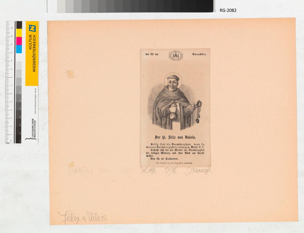 Gebetszettel mit Lithographie des heiligen Felix von Valois - Patron der Gefangene; rückseitige Beschreibung seines Lebens.