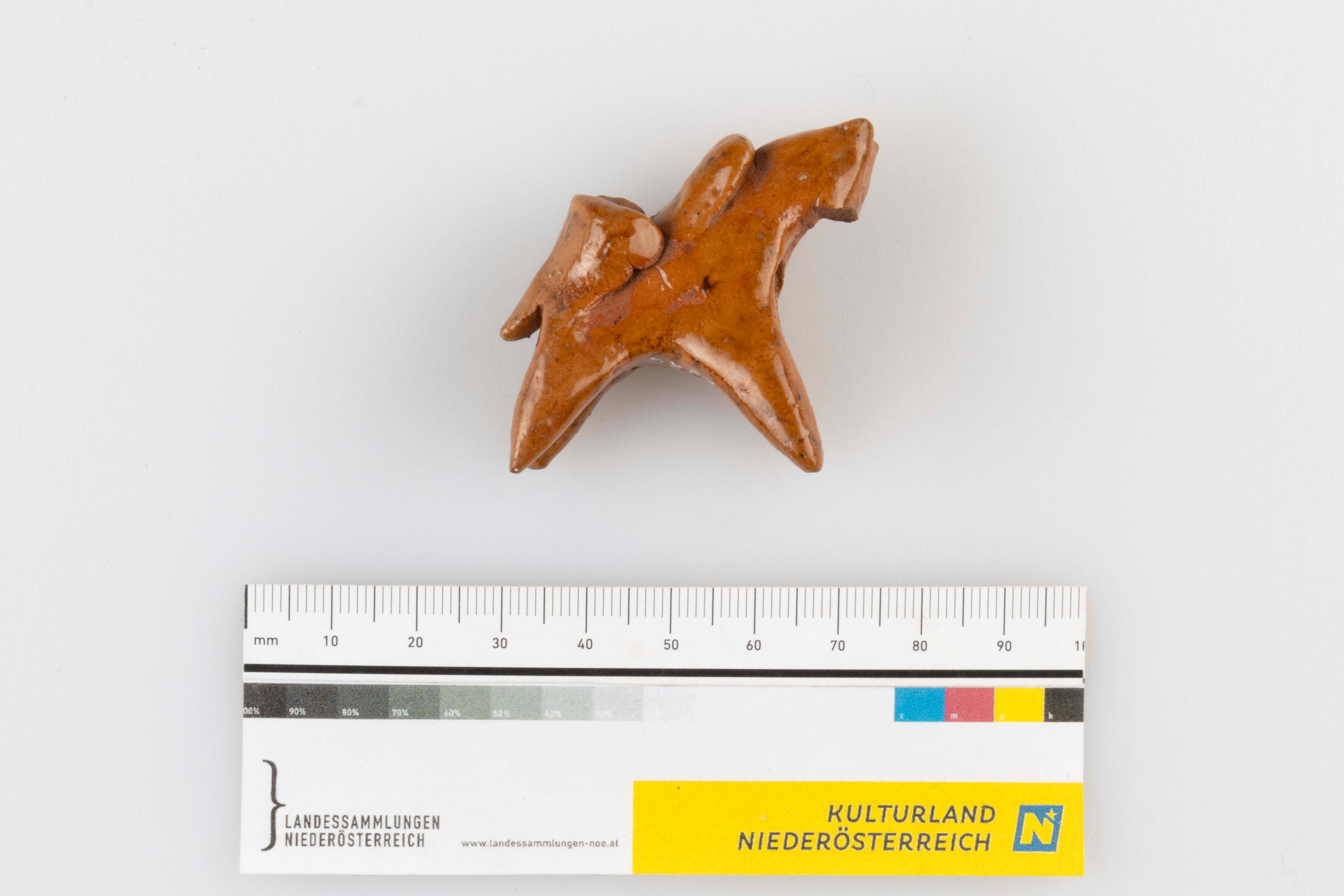 Ein kleines Pferdchen aus braunrotem, feinem Ton, überzogen mit einer dünnen, farblosen Bleiglasur. Die Vorder- und Hinterbeine des Pferdes sind ausgestreckt und der Kopf ist eingezogen. Der Sattel hat einen hochgezogenen Vorderteil und ist im hinteren Bereich wie ein Stuhl geformt. Die Brust des Tieres ist von vorne durchlocht, um eine hölzerne Lanze aufzunehmen. Es handelt sich höchstwahrscheinlich um einen Teil eines Turnierspiels für Kinder.