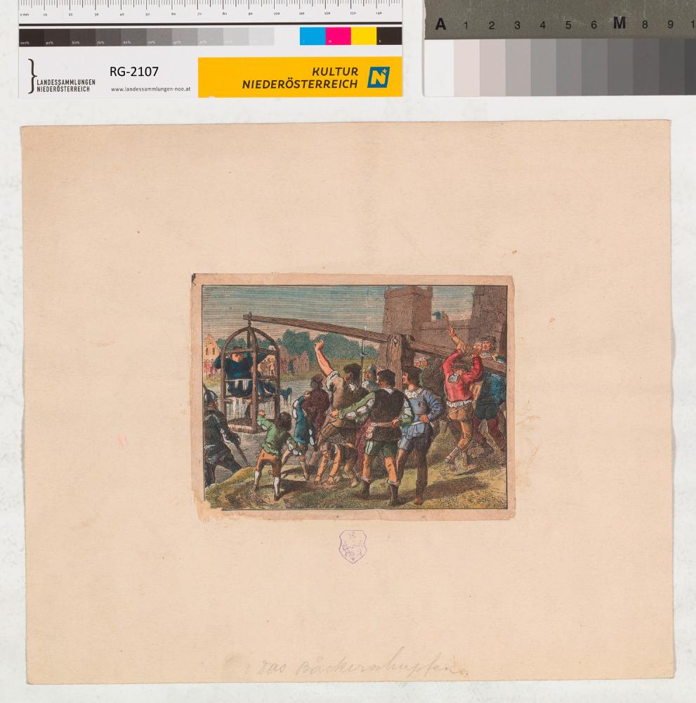 Kolorierter Kupferstich der Ehrenstrafe des Bäckerschupfens. Diese Straf war für Vergehen gegen die Qualität oder das Gewicht der hergestellten Backwaren des Bäckers. Kupferstich aus dem Buch von Wilhelm Kisch: "Wien. Die alten Strassen und Plaetze Wien's und ihre historisch interessanten Haeuser : ein Beitrag zur Culturgeschichte Wiens mit Rücksicht auf die vaterländische Kunst, Architektur, Musik und Literatur."