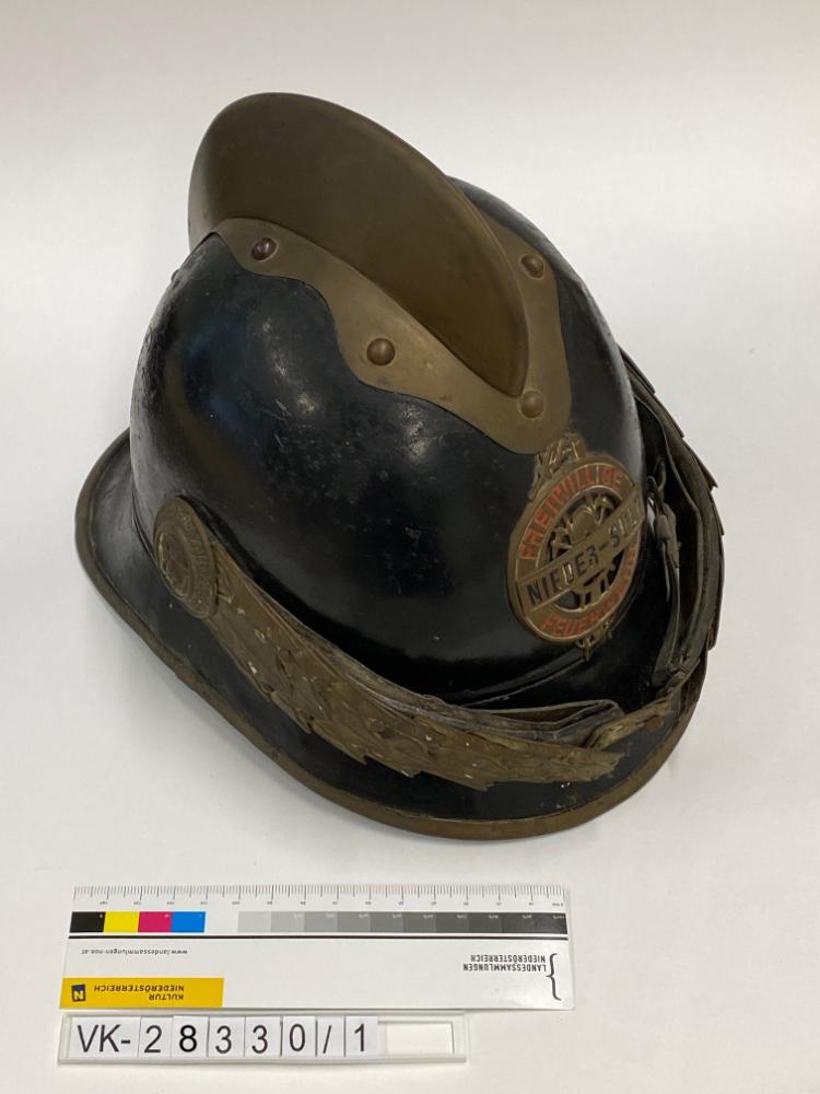 Feuerwehrhelm (Kommandantenhelm) der Feuerwehr Niedersulz, Emblem aus Messing. Der Helmkamm ist versilbert, seitlich sind Schuppenbänder aus Messing angebracht.
