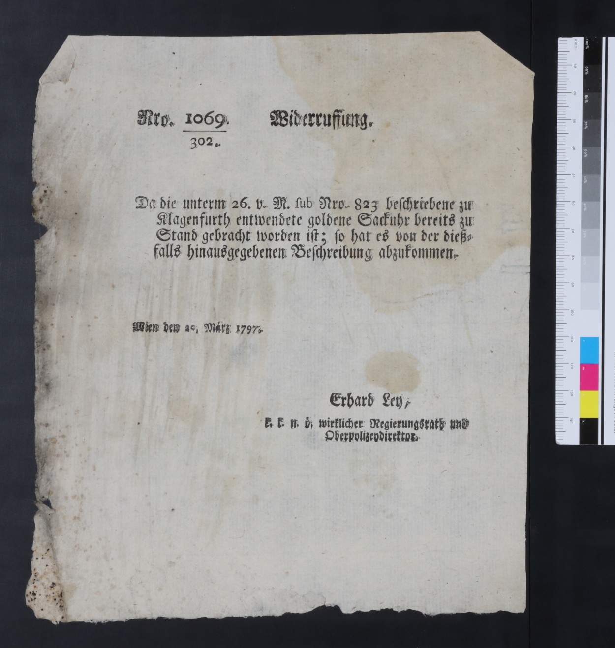 "Widerrufung. Da die unterm 26. v. M. sub Nro. 823 beschriebene zu Klagenfurth entwendete goldene Sackuhr bereits zu Stand gebracht worden ist; so hat es von der dießfalls hinausgegebennen Beschreibung abzukommen. [...] Wien den 20. März 1797. Erhard Ley; k.k. n.ö. wirklicher Regierungsrath und Oberpolizeydirektor."