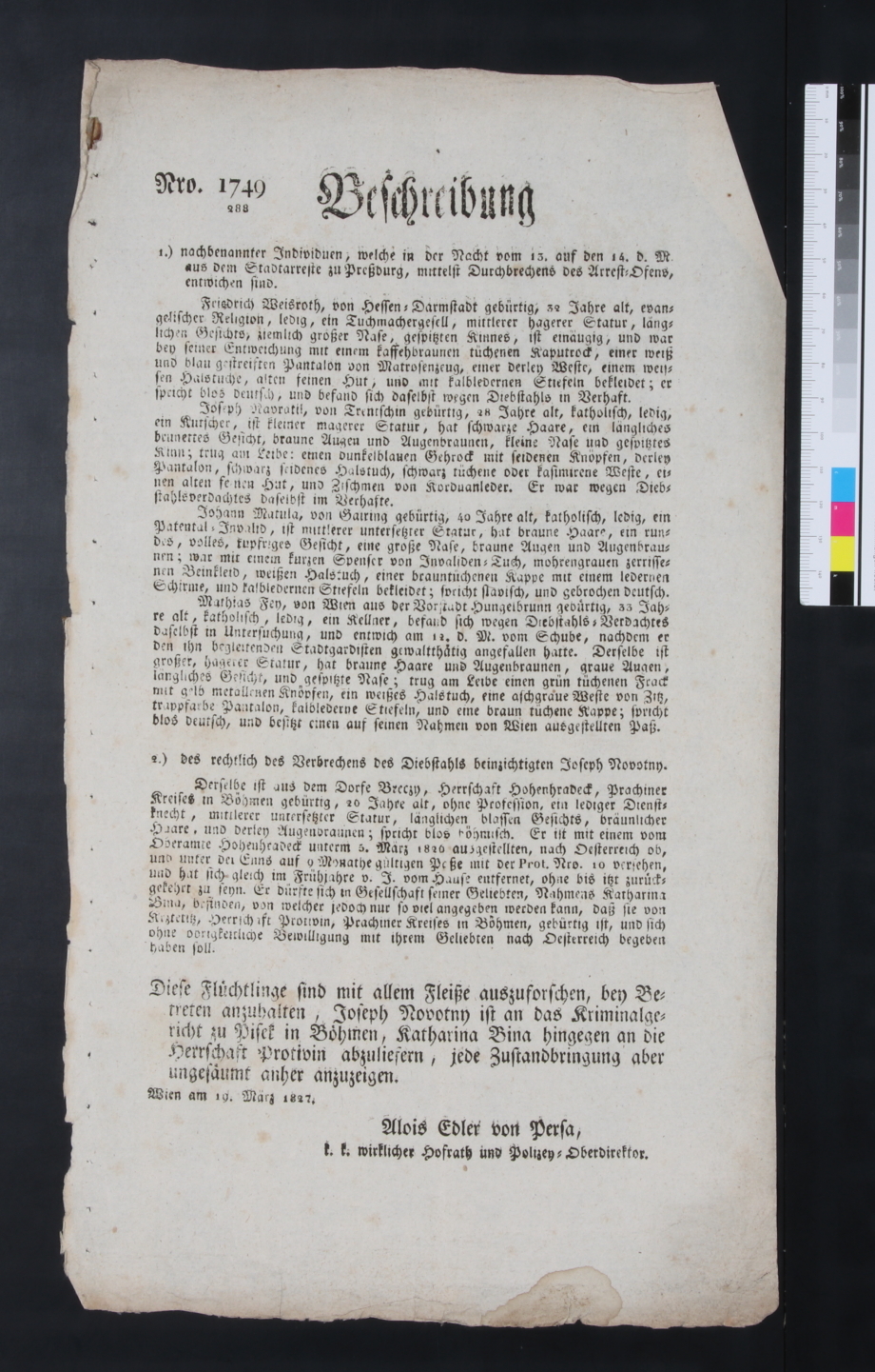 "Beschreibung 1) nachbenannter Individuen, welche in der Nacht vom 13. auf den 14. d. M. aus dem Stadtarreste zu Preßburg, mittelst Durchbrechens des Arrest=Ofens, entwichen sind. [...] Wien am 19. März 1827. Alois Edler von Persa, k.k. wirklicher Hofrath und Polizey=Oberdirektor.
