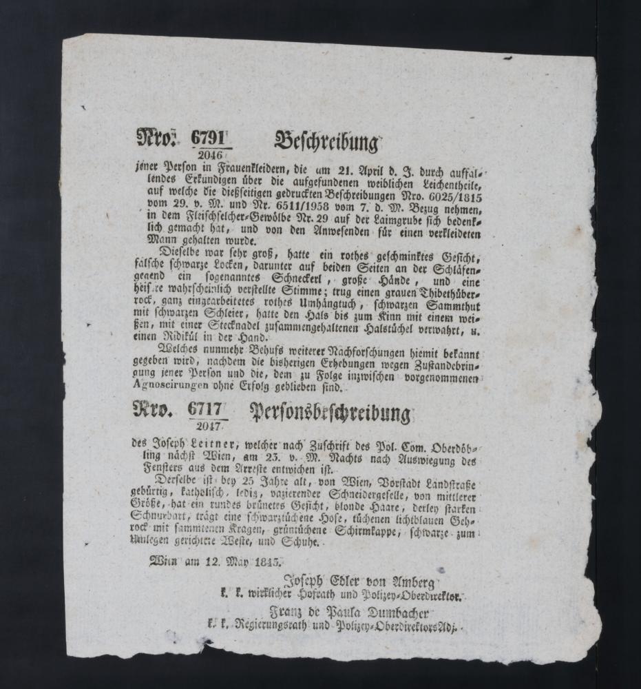 Personenbeschreibungen - "Wien am 12. May 1843. Joseph Edler vom Amberg k.k. wirklicher Hofrath und Polizey=Oberdirektor. Franz de Paula Dumbacher. k.k. Regierungsrath und Polizey=Oberdirektors Adj."