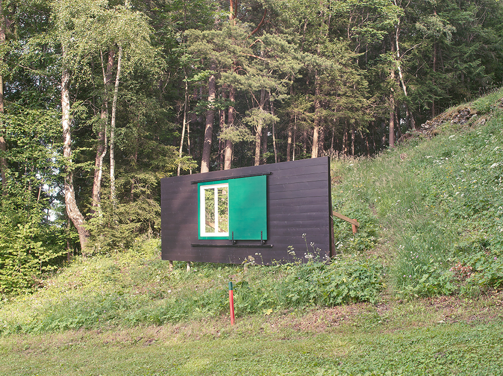 Das Landhaus Khuner im Semmering-Rax-Gebiet ist eine Ausnahme. Als eine der letzten Arbeiten Adolf Loos´ hebt sich das Bauwerk sichtbar von seinem architektonischen Umfeld ab. Loos bahnbrechendes Konzept des »Raumplans«, das Denken in Räumen und Kuben und nicht in Plänen, wurde im Looshaus verwirklicht. Hannes Zebedin verknüpft in seiner Installation am legendären alpinen Golfplatz die Moderne mit den traditionellen Formen. Ein Ausschnitt der Fassade der Villa wurde nachgebaut, wie eine Art Schutzwall steht diese nun im Hang. Das bei Loos gefundene Fensterladensystem reguliert durch seine Bewegung »Ströme«, öffnet und schließt sich wie eine Schleuse. Die industrialisierte Landwirtschaft hat mittlerweile auch alpine bäuerliche Formen der Arbeit zum Verschwinden gebracht. Zebedin erinnert sich ihrer und verwendet eine Formation der vergessenen Heumännchen und Schwedenreitern in strahlenförmiger Anordnung für seine Installation.