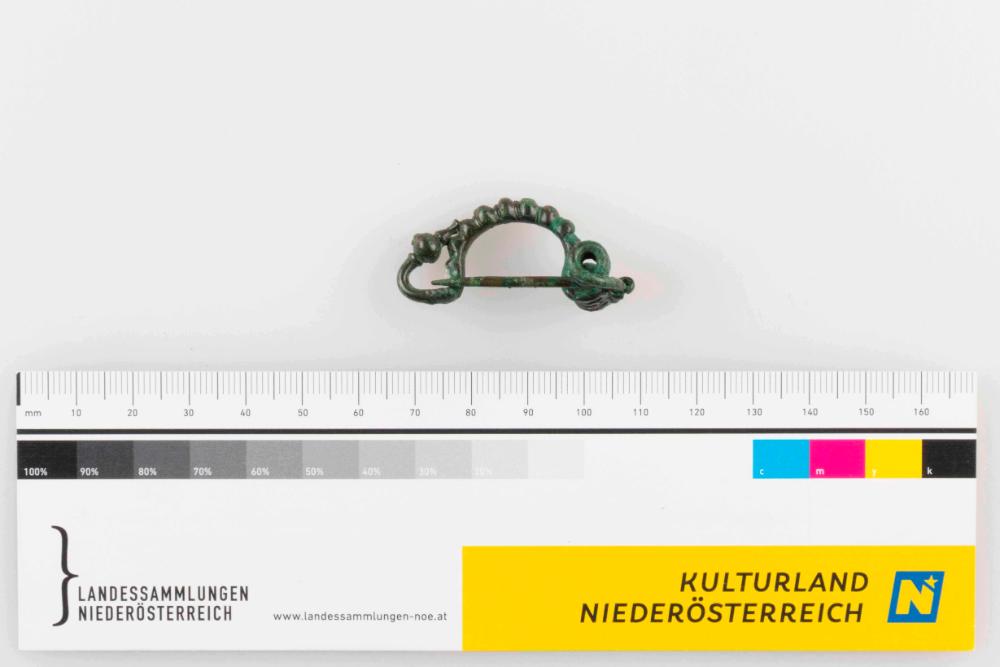 Die Fibel mit Kettchen zeichnet sich durch eine symmetrische, außen liegende Kopfspirale mit sechs Windungen aus. Der halbkreisförmige Bügel weist perlförmige Rippen auf, die durch schmale Zwischenräume voneinander getrennt sind. Die Fibel hat eine kugelförmige Fußzier. Vor und nach der Kugel befindet sich ein schmaler Wulst. Der Fuß der Fibel liegt am Bügel auf.