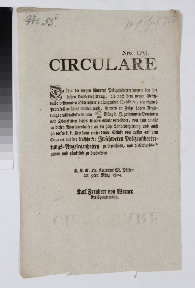 Einseitiger Druck. Langform Titel: „CIRCULARE Da ueber die wegen schweren Polizeyuebertretungen bey der hohen Landesregierung, als nach dem neuen Gesetzbuche bestimmten Oberrichter einlangenden Exhibita, ein eigenes Protokoll gefuehret werden muß, so wird in Folge hohen Regierungspraesidialdekrets vom 5ten/9ten Maerz d. J. gesammten Dominien und Obrigkeiten dieses Kreises anmit verordnet, von nun an alle in diesen Angelegenheiten an die hohe Landesregierung und auch an dieses k. k. Kreisamt einsendende Stuecke von aussen auf dem Couvert mit der Auffschrift: In schweren Polizeyuebertretungs=Angelegenheiten zu bezeichnen, und diese Vorschrift genau und puenktlich zu beobachten. / K. K. N. Oe. Kreisamt St. Poelten den 1ten Maerz 1804. / Karl Freyherr von Werner / Kreishauptmann.“