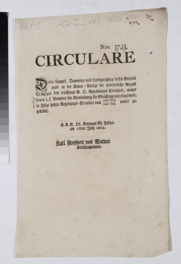 Einseitiger Druck. Langform Titel: „CIRCULARE Denen saemmtl. Dominien und Landgerichten dieses Viertels wird in der Neben = Anlage die erforderliche Anzahl Exemplare des erlassenen N. O. Appellations Circulars, womit denen l. f. Beamten die Verwendung fuer Straeflinge untersgt wird, in Folge hohen Regierungs=Circulare vom 19ten Juny/16ten July anmit zugestellet. / K. K. N. Oe. Kreisamt St. Poelten am 16ten July 1804. / Karl Freyherr von Werner / Kreishauptmann.“