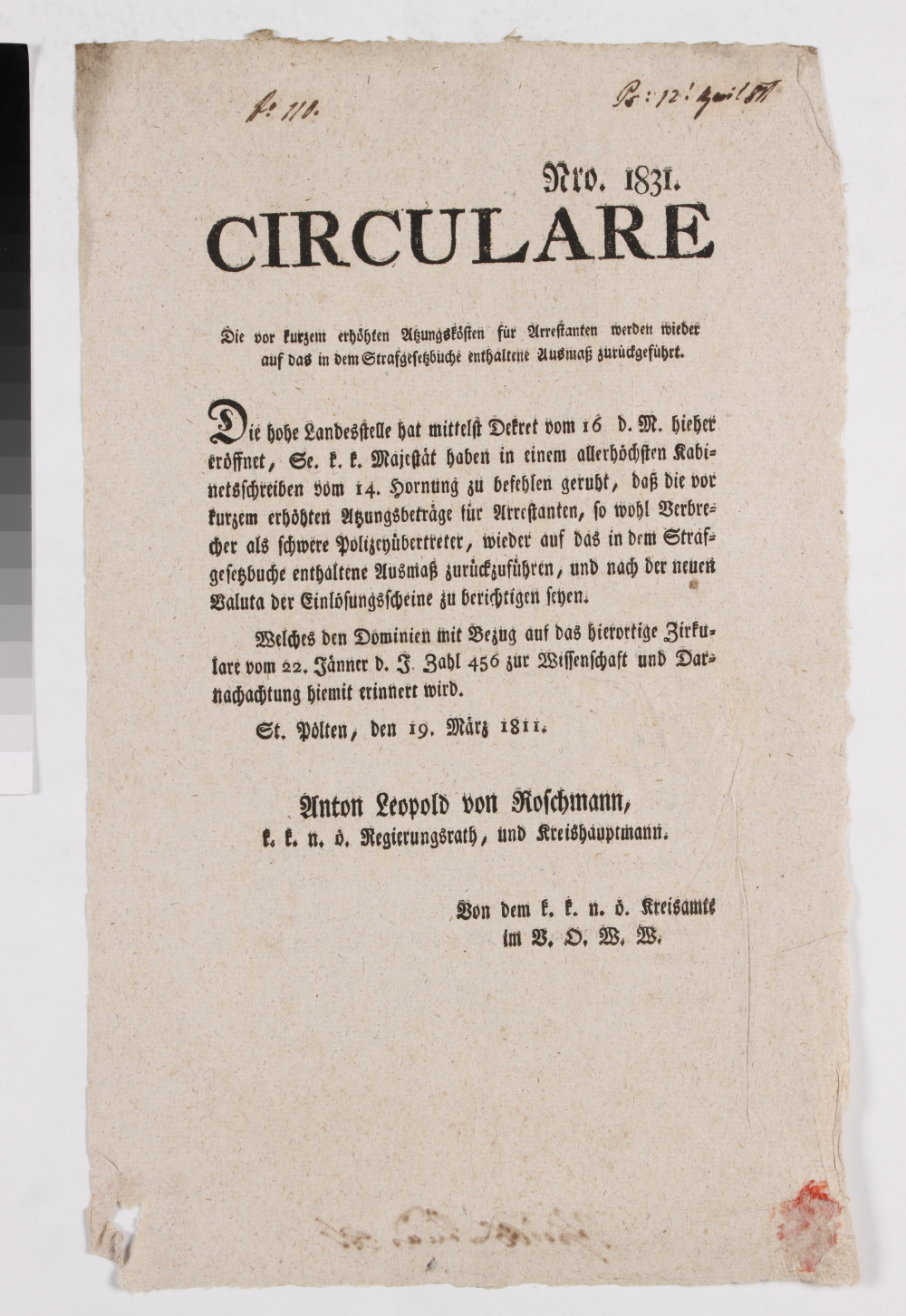 Einseitiger Druck. Langform Titel: „CIRCULARE Die vor kurzem erhoehten Atzungskoesten fuer Arrestanten werden wieder auf das in dem Strafgesetzbuche enthaltene Ausmaß zurueckgefuehrt. […] St. Poelten, den 19. Maerz 1811. / Anton Leopold von Roschmann, k. k. n. oe. Regierungsrath, und Kreishauptmann. / Von dem k. k. n. oe. Kreisamte / im V. O. W. W.“