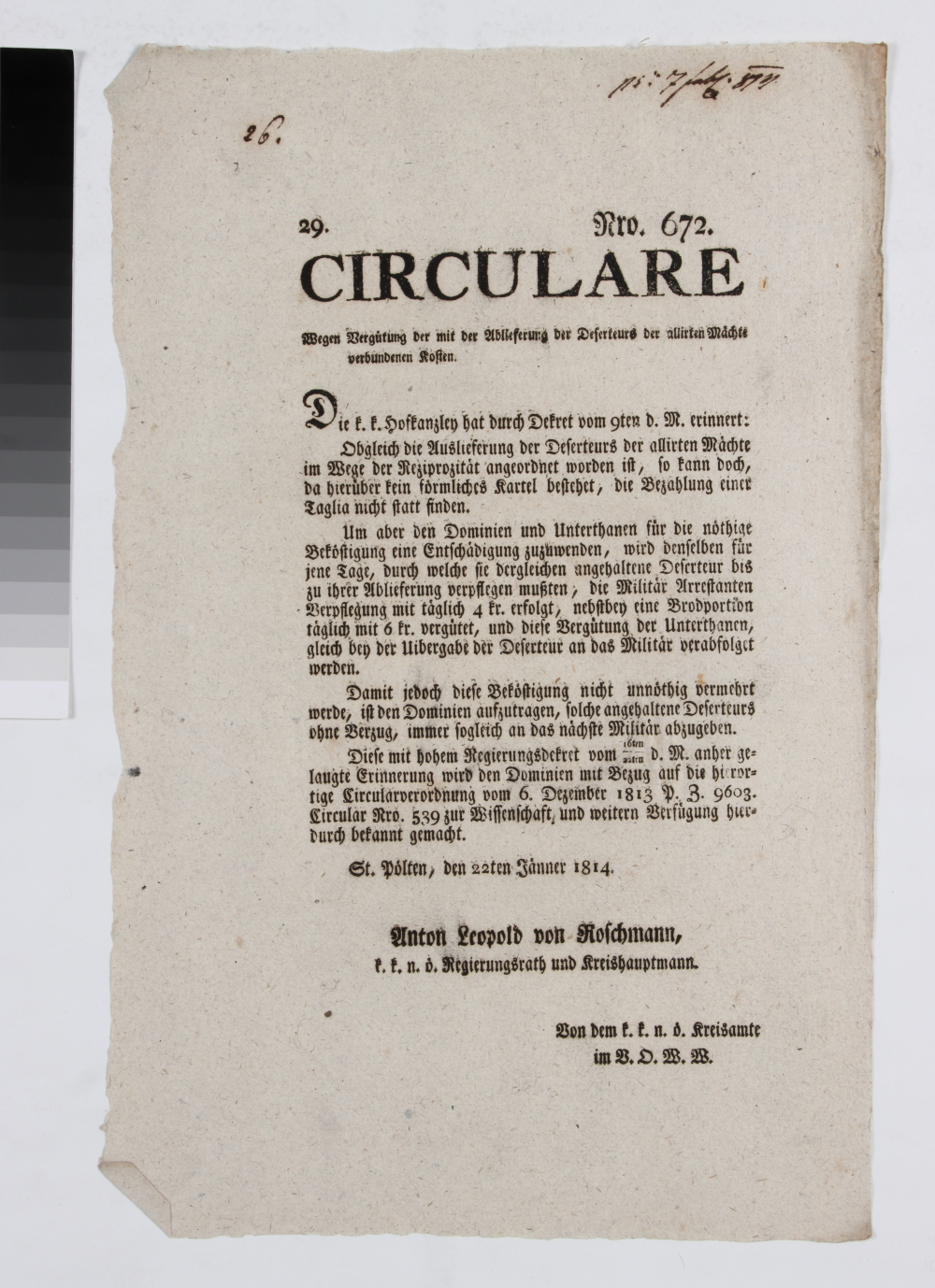 „CIRCULARE Wegen Verguetung der mit der Ablieferung der Deserteurs der allirten Maechte verbundenen Kosten. […] St. Poelten. den 22ten Jaenner 1814. / Anton Leopold von Roschmann. k. k. n. oe. Regierungsrath und Kreishauptmann. / Von dem k. k. n. oe. Kreisamte / im V. O. W. W.“