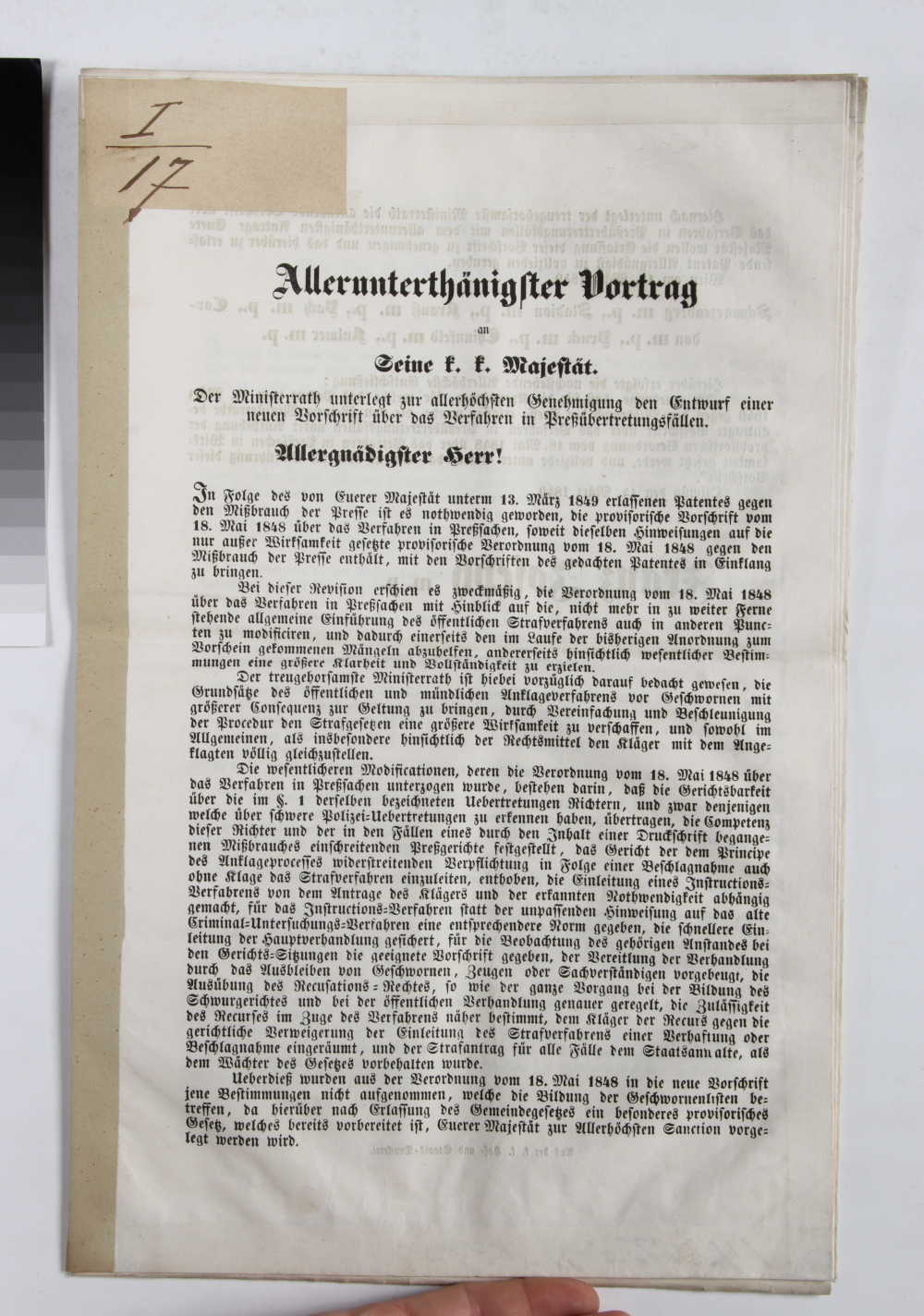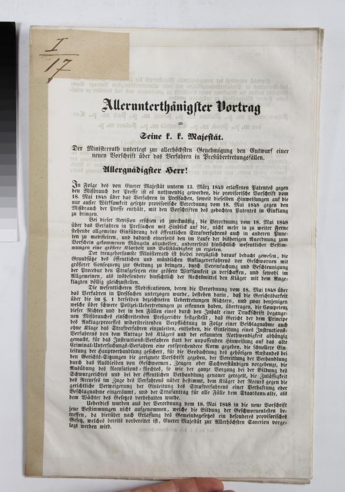 Zehnseitiger Druck; Seite 1-2 „Vortrag“; Seite 3-10 „Vorschrift“. Langform Titel: „Allerunterthänigster Vortrag an Seine k. k. Majestät. Der Ministerrath unterlegt zur allerhöchsten Genehmigung den Entwurf einer neuen Vorschrift über das Verfahren in Preßübertretungsfällen. [...] Wien am 14. März 1849. / Schwarzenberg m. p.. Stadion m. p.. Krauß m. p.. Bach m. p.. Cordon m. p.. Bruck m. p.. Thinnfeld m. p.. Kulmer m. p. / Hierüber erfolgte nachstehende Allerhöchste Entschließung: / Ich genehmige [...] die [...] Vorschrift [...] in Wirksamkeit gesetzt werde [...]. / Ollmütz am 14. März 1849. / Franz Joseph m. p.“ / „Vorschrift über das Verfahren in Preßübertretungsfällen. [...] / Schwarzenberg. Stadion. Krauß. Bach. Cordon. Bruck. Thinnfeld. Kulmer.“