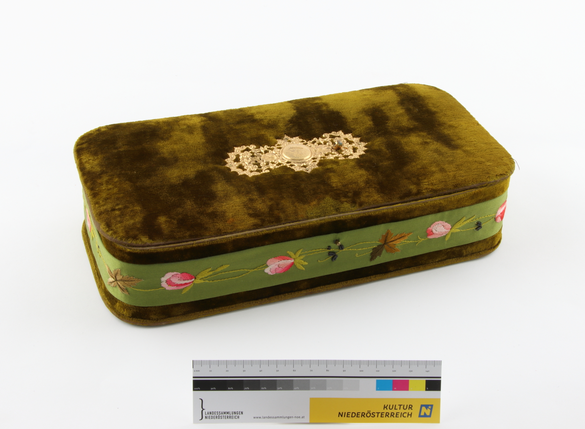Grüne Schatulle aus Samt, umlaufen mit floral besticktem Seidenband besetzt (Plattstichstickerei mit Bouillondraht), an der Oberseite goldener Beschlag, ursprl. mit Griff, Unterseite mit schwarzem Papier beklebt und vier Metallnieten. Innen mit Moiré-Papier ausgekleidet.