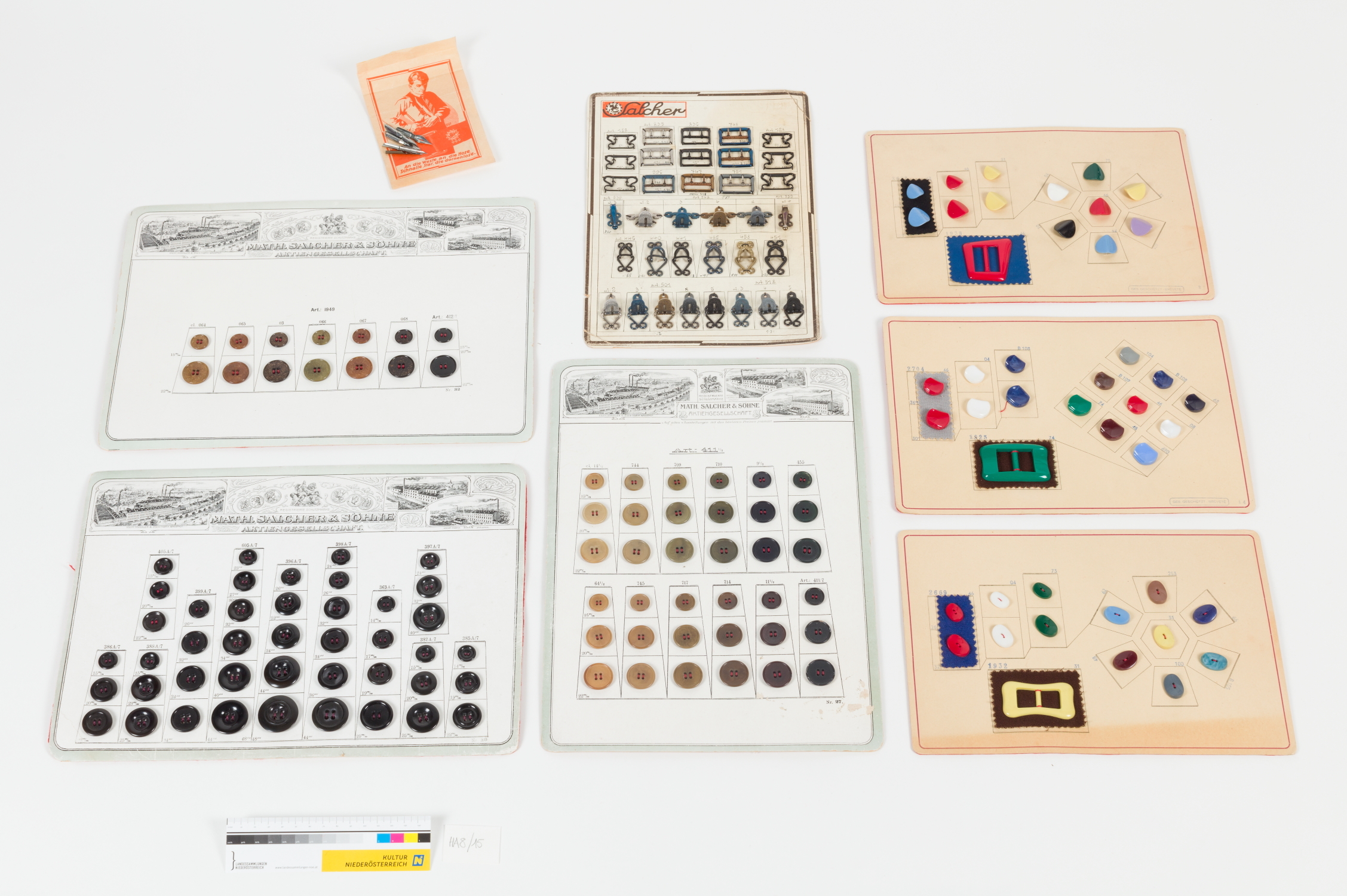 Kartontafeln mit Knöpfen, Schnallen und Ösen. 3 Tafeln mit Knöpfen in Schwarz und Brauntönen, 3 Tafeln mit bunten Knöpfen und passender Gürtelschnalle, die Rückseiten mit rotem Filz beklebt. 1 Tafel mit metallenen Gürtelschnallen und Haken mit Ösen. Beigelegt ein Papiersäckchen mit 7 Schreibfedern verschiedener Größen.