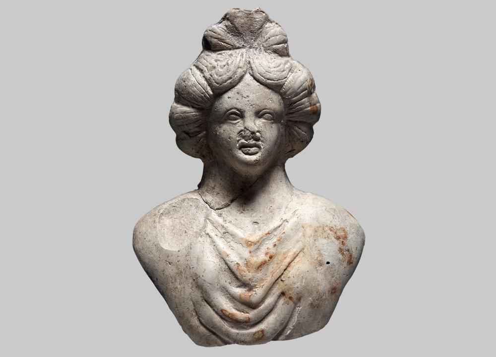 Terrakottabüste einer Muttergottheit. Der Kopf der Göttin lässt eine komplizierte Hochsteckfrisur erkennen. Das Haar ist in der Mitte gescheitelt, zu je vier Strähnen zusammengefasst, nach hinten gekämmt und über der Stirn und am Hinterkopf zu je einem großen Knoten gebunden. Das Gesicht hat feine, liebliche Züge, das Gewand ist an den Schultern geknotet, die Falten sind realistisch wiedergegeben. Die Statuette wurde in Zentralgallien hergestellt.