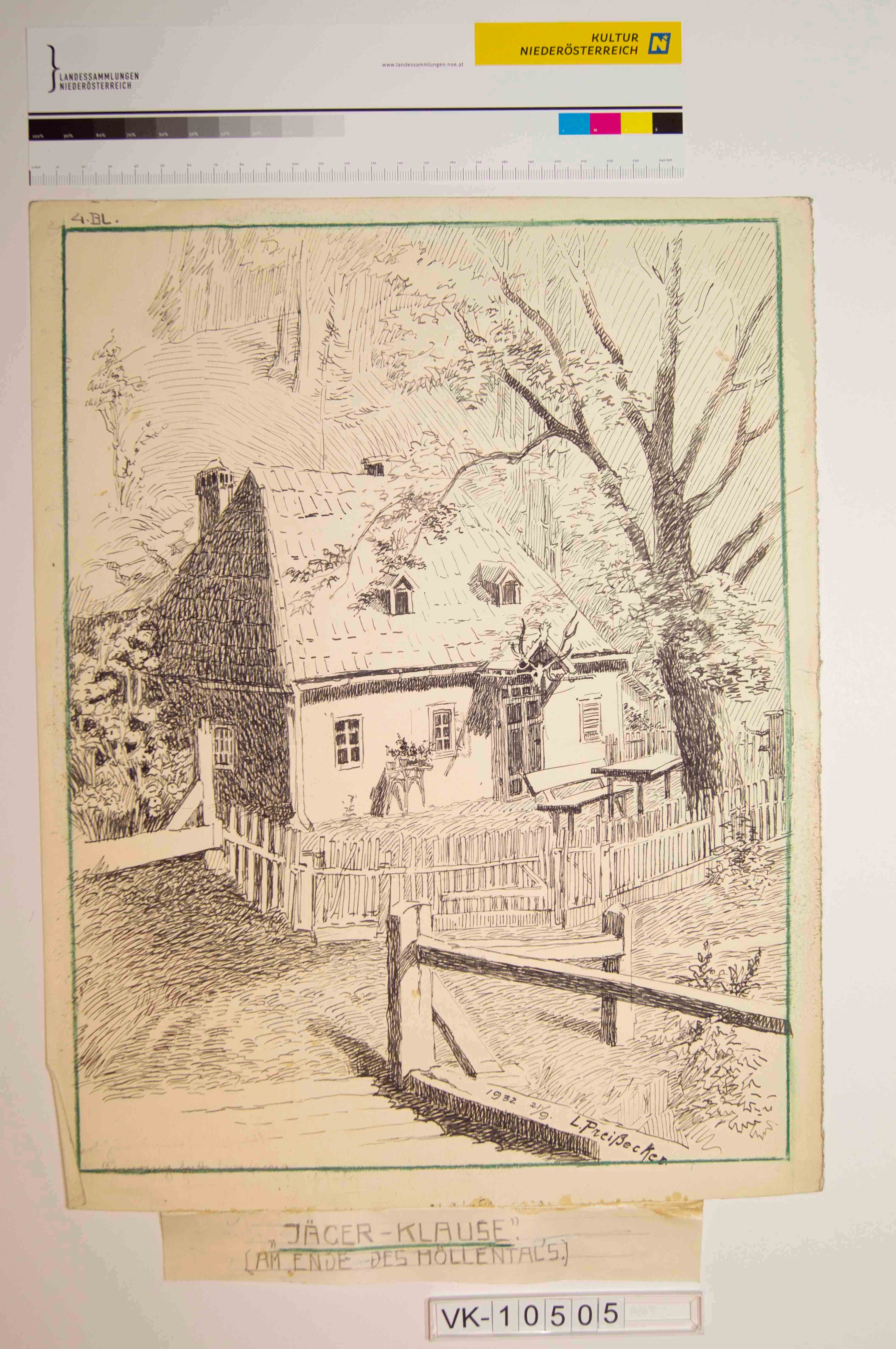 Zeichnung aus der Serie Waldviertler Heimatbilder: "JÄGER-KLAUSE (AM ENDE DES HÖLLENTAL'S.)", sign. L. Preißecker 21.9. 1932