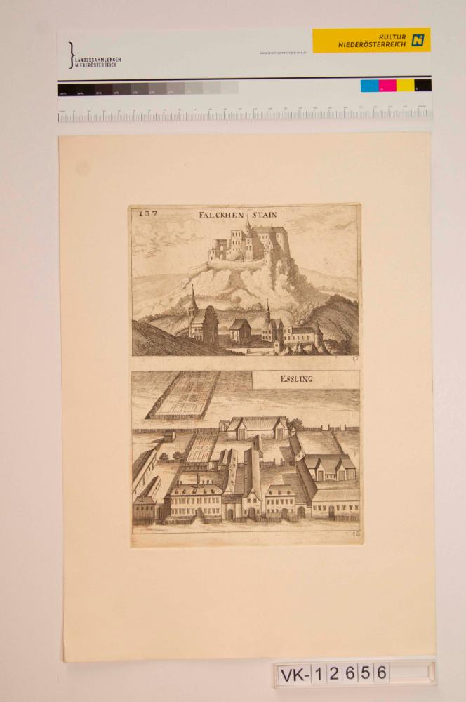 Vischer-Stich mit der Darstellung von Falkenstein und Essling, Bildtext: "FALCKHEN STAIN" /"ESSLING"