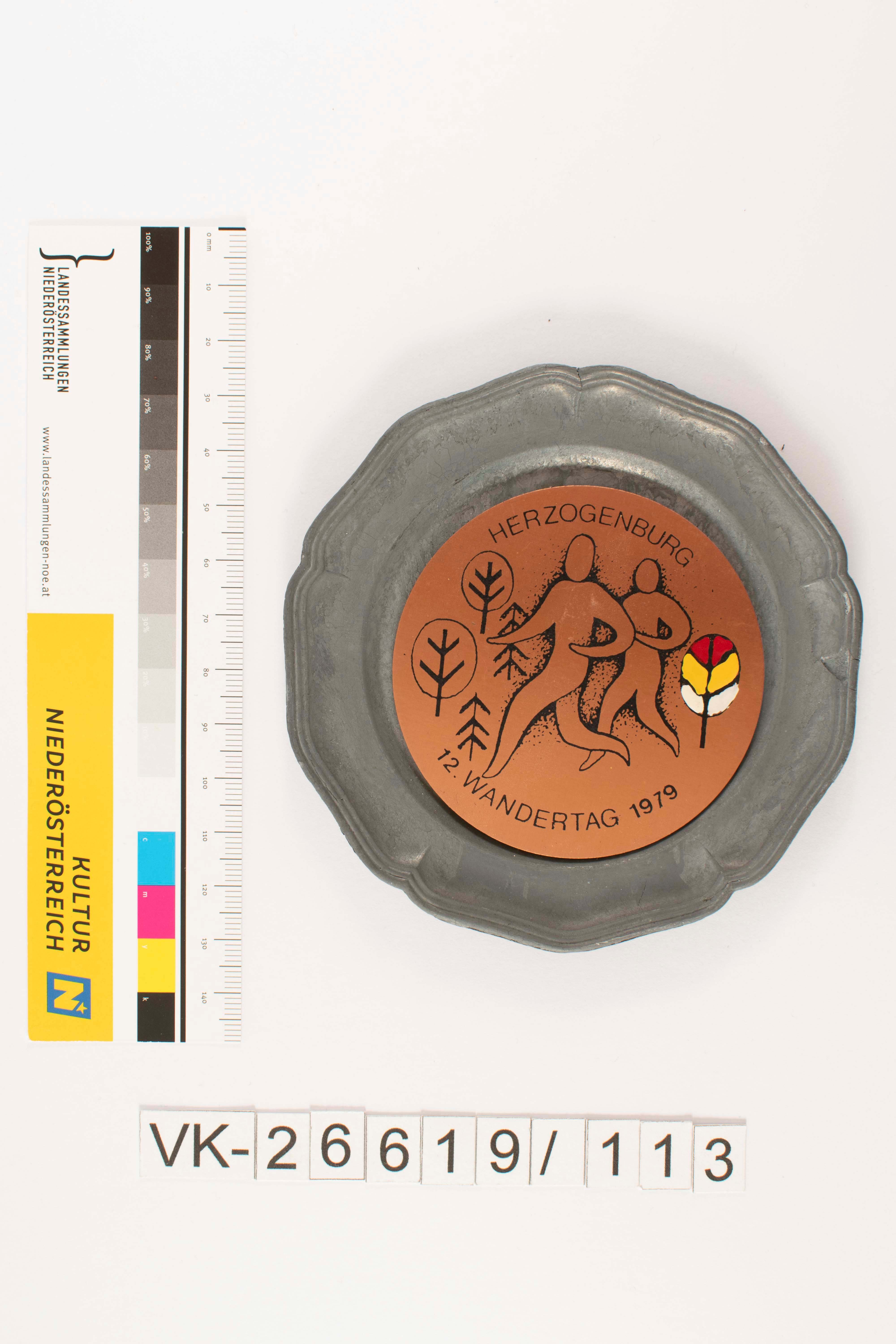 Wanderabzeichen in Form eines Ziertellers aus Weißmetallblech mit mittig angebrachter runder Messingplakette welche zwei Läufer inmitten stilisierter Pflanzen/Ranken/Pfeilen darstellt; beschriftet mit Herzogenburg 12. Wandertag 1979; rückseitig mittig im oberen Bereich Aufhängevorrichtung und darunter Logo mit Engelchen; Aufkleber mit der Aufschrift Fiala sowie unleserlichen Ziffern.