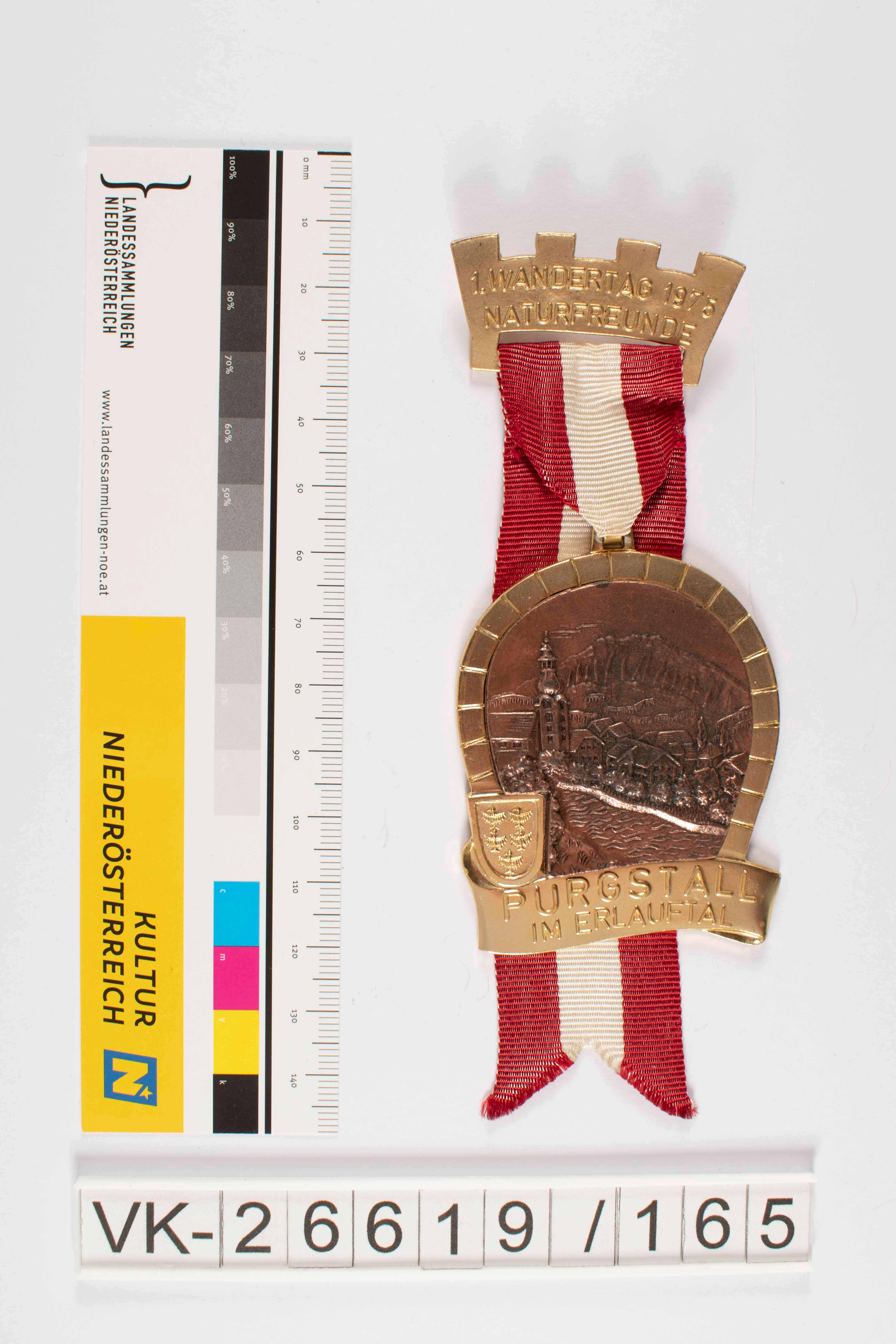 Mehrteilige Wandernadel aus Buntmetall mit langovalem bis eiförmigem Anhänger mit untenstehendem Banner mit der Aufschrift Purgstall im Erlauftal und niederösterreichischer Flagge, mittig ist ein bronzefarbenes Landschaftsrelief verklebt und oben mittig befindet sich eine Aufhängeöse; rot-weiß-rotes Stoffband und querlänglicher Nadelkörper in Form einer Krone oder mit stilisierten Mauerzinnen und beschriftet mit 1. Wandertag 1975 Naturfreunde; rückseitig Nadel mit Gelenk und Sicherheitsverschluss sowie Herstellerangaben.