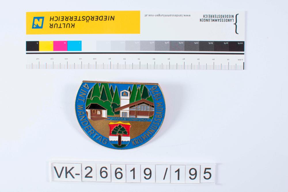 Wandernadel in Dreiviertelkreisform mit gerade Oberkante und bunter Emaillierung; Darstellung des Steinbründls mit dahingehender Beschriftung sowie Wappen mit Baum; umlaufende, blau hinterlegte Aufschrift 4. Int. Wandertag Krummnussbaum 1976; rückseitig Nadel mit spiralförmiger Spannung und U-förmig gebogener Nadelrast.