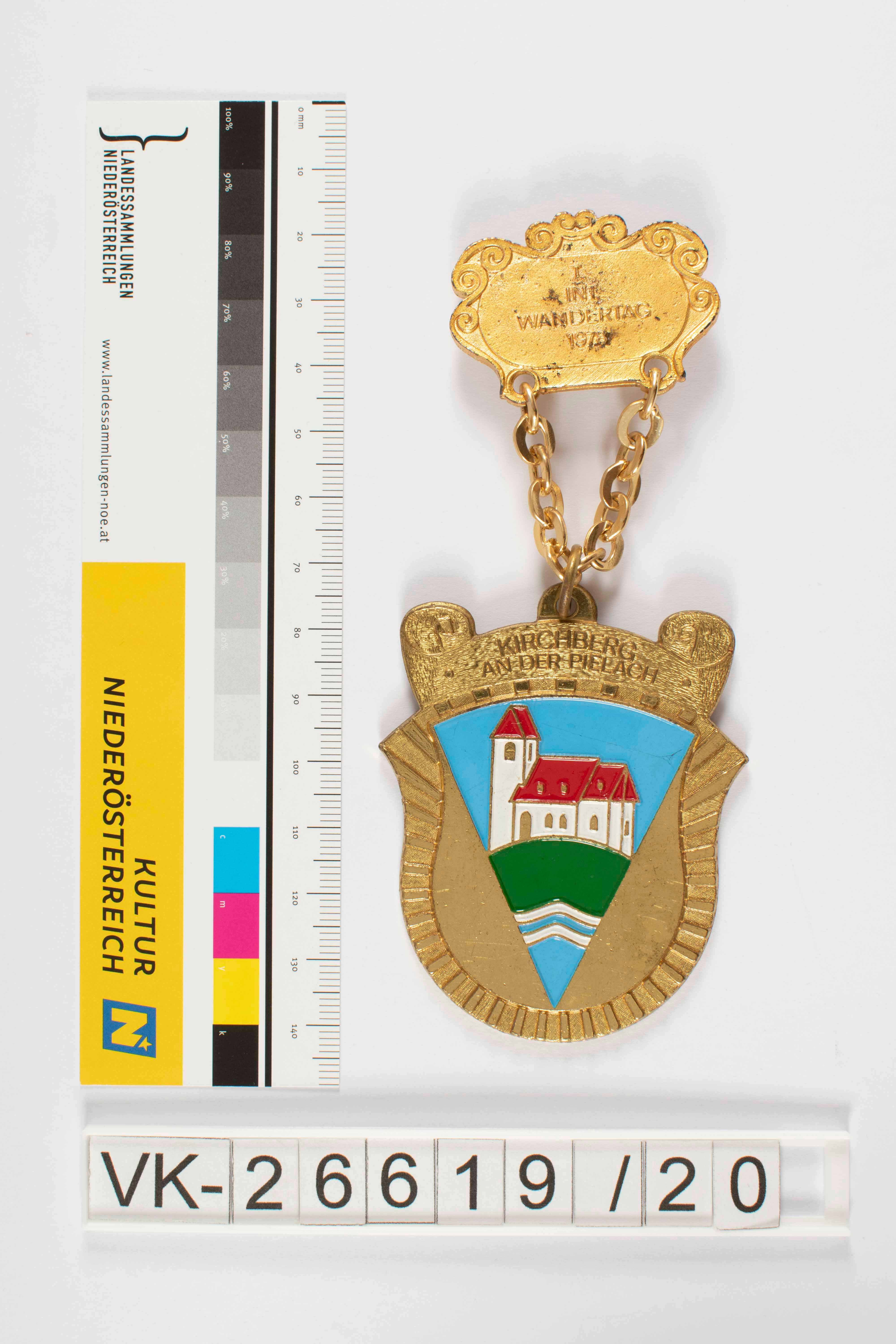 Mehrgliedrige Wandernadel welche aus zwei Teilen besteht die durch einen Ring und eine Kette miteinander verbunden sind; unterer Teil in Wappenform mit runder Aufhängeöse oben mittig; bunte Darstellung eines Ortswappens und Beschriftung Kirchberg an der Pielach in obenstehendem Banner; oberer Teil hat unten zwei Lochungen an welchen die Kette angebracht ist und umlaufende Verzierung; beschriftet mit I. Int. Wandertag 1978; rückseitig Nadel mit spiralförmiger Spannung und U-förmig gebogener Rast sowie Herstellerangaben.