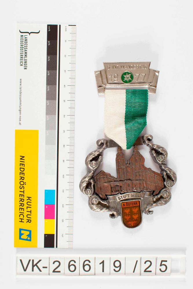 Mehrgliedrige Wandernadel, schwer und durchbrochen; zwei Teile durch grün-weißes Band verbunden; oberer Teil aus silbernem Metall, beschriftet mit 6. Int. Wandertag 1977 und Edelweißlogo; unterer Teil ist wappenförmig mit beidseitig hinaufziehendem Rankenmotiv, welches eine bronzene Darstellung des Stiftes Melk darstellt und unten mittig eine mit buntem Kunststoff „emaillierte“ Niederösterreichflagge trägt; beschriftet mit Stift Melk; rückseitig auf dem oberen Glied eine Nadel mit spiralförmiger Spannung und U-förmig gebogener Nadelrast; unterhalb Herstellerangaben, vgl. VK-26619/13.