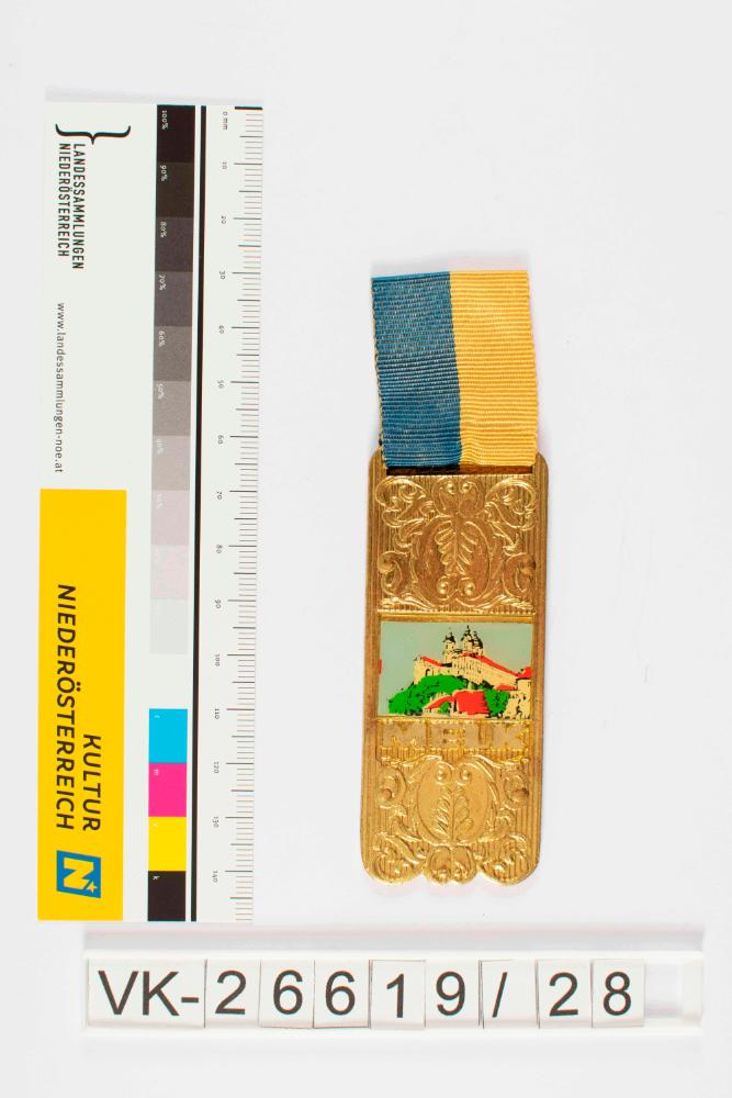 Wanderabzeichen in Form eines hochrechteckigen, goldenen Anhängers mit Pflanzenrankenornamentik und bunter Darstellung des Stiftes Melk; darunter erhabene Beschriftung Melk; oben ist der Anhänger quer durchbrochen und bildet so eine schmallängliche Aufhängeöffnung zum Durchziehen eines Bandes; Stoffband in blau-gelb durchgefädelt und vernäht.