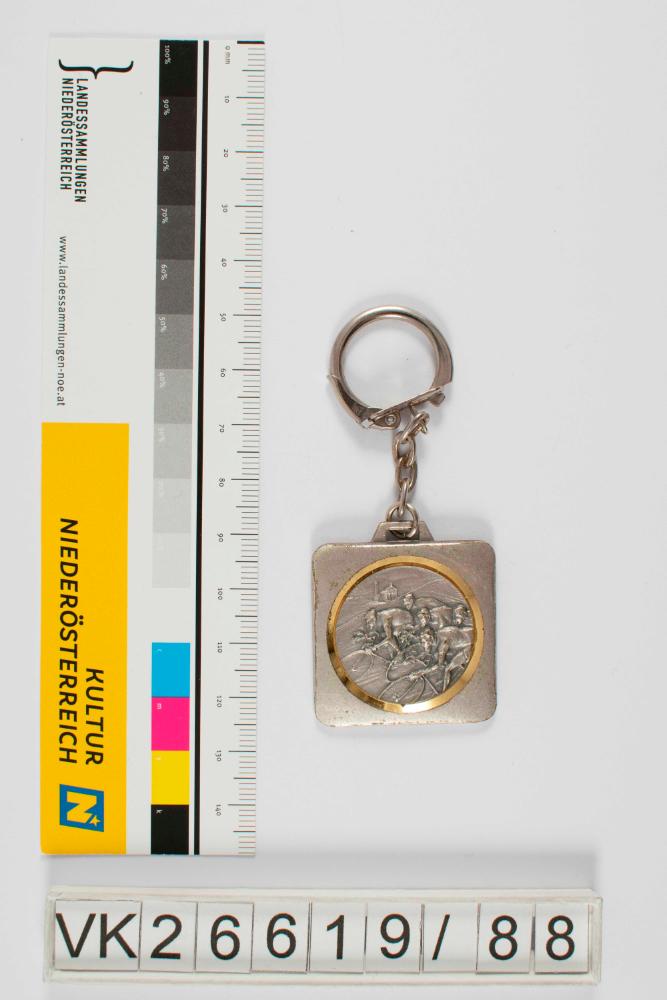 Radwanderabzeichen in Form eines (Schlüssel)Anhängers; quadratischer Anhänger mit gerundeten Ecken und kreisrunder, goldgerahmter Vertiefung mit reliefartiger Abbildung von Fahrradfahrern; trapezförmige Öse oben mittig; mehrgliedrige Kette mit langovalen Gliedern und runder Aufhänger mit Schnappverschluss; rückseitig goldener Aufkleber mit der Aufschrift 11. Herzogenburger Radwandertag.