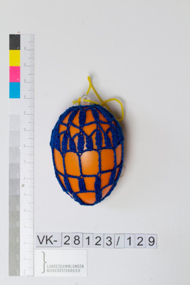 Kunststoffei braun, umhäkelt mit blauem Garn, Musterung: durchbrochen, Stäbe ergeben Gitter, teilweise mit Füllung; Bändchen: gelb, Öse aus Kunststoff