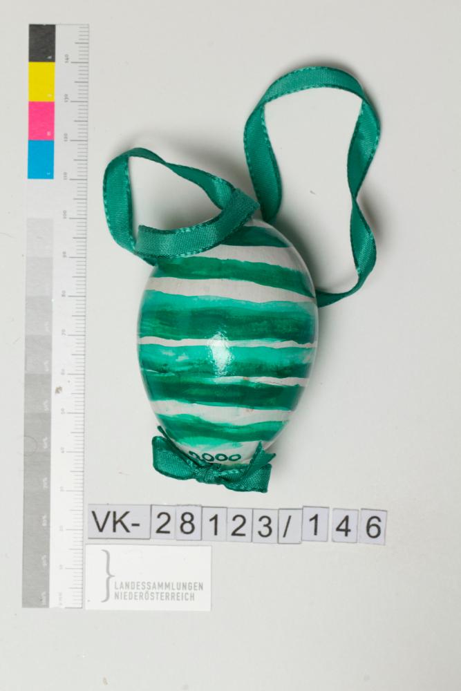 Hühnerei, ausgeblasen, bemalt, Musterung: auf weißem Grund umlaufend übereinander Ringe in grün (wie Gmundner Keramik), monogrammiert "LH", datiert "2000"; Bändchen: grün, mit Masche fixiert
