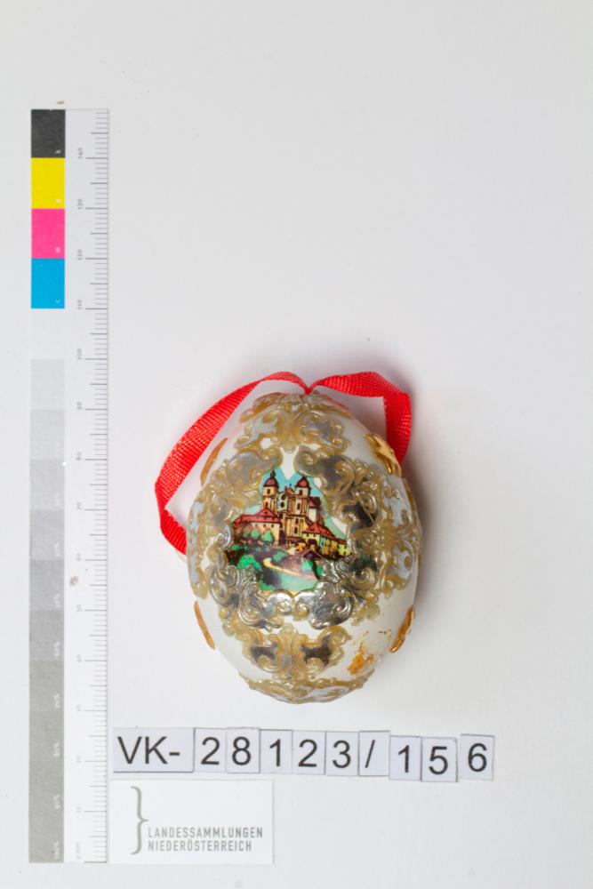 Hühnerei, ausgeblasen, weiß, Musterung: Gnadenstuhl und Basilika Sonntagberg (ausgeschnitten und verklebt), umrahmt von Ornamenten (Wachs, silber überzogen), einzelne Sterne (Wachs, gold überzogen); Bändchen: rot, mit Wachs fixiert