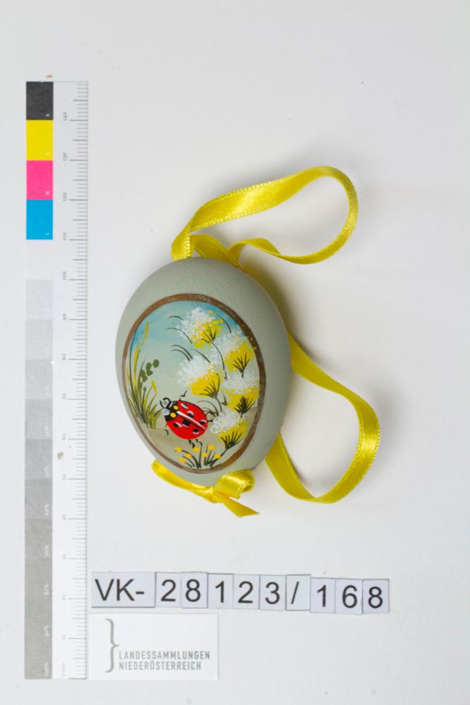 Hühnerei, ausgeblasen, bemalt, Musterung: auf grauem Grund Blumen, Gräser, Marienkäfer, Rückseite stark stilisierte Blüten (bestehen nur aus Punkten); Bändchen: gelb, mit Masche fixiert
