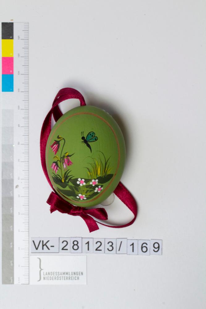 Hühnerei, ausgeblasen, bemalt, Musterung: auf grünem Grund Blumen, Gräser, Schmetterling, Rückseite stark stilisierte Blüten (bestehen nur aus Punkten); Bändchen: dunkelrot, mit Masche fixiert