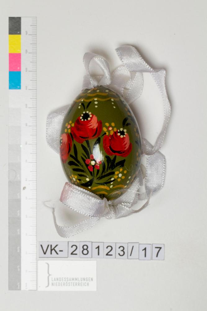 Hühnerei, ausgeblasen, bemalt, Musterung: auf olivgrünem Blütengirlanden, Blumenstrauß; Bändchen: Stoff weiß, mit Masche fixiert