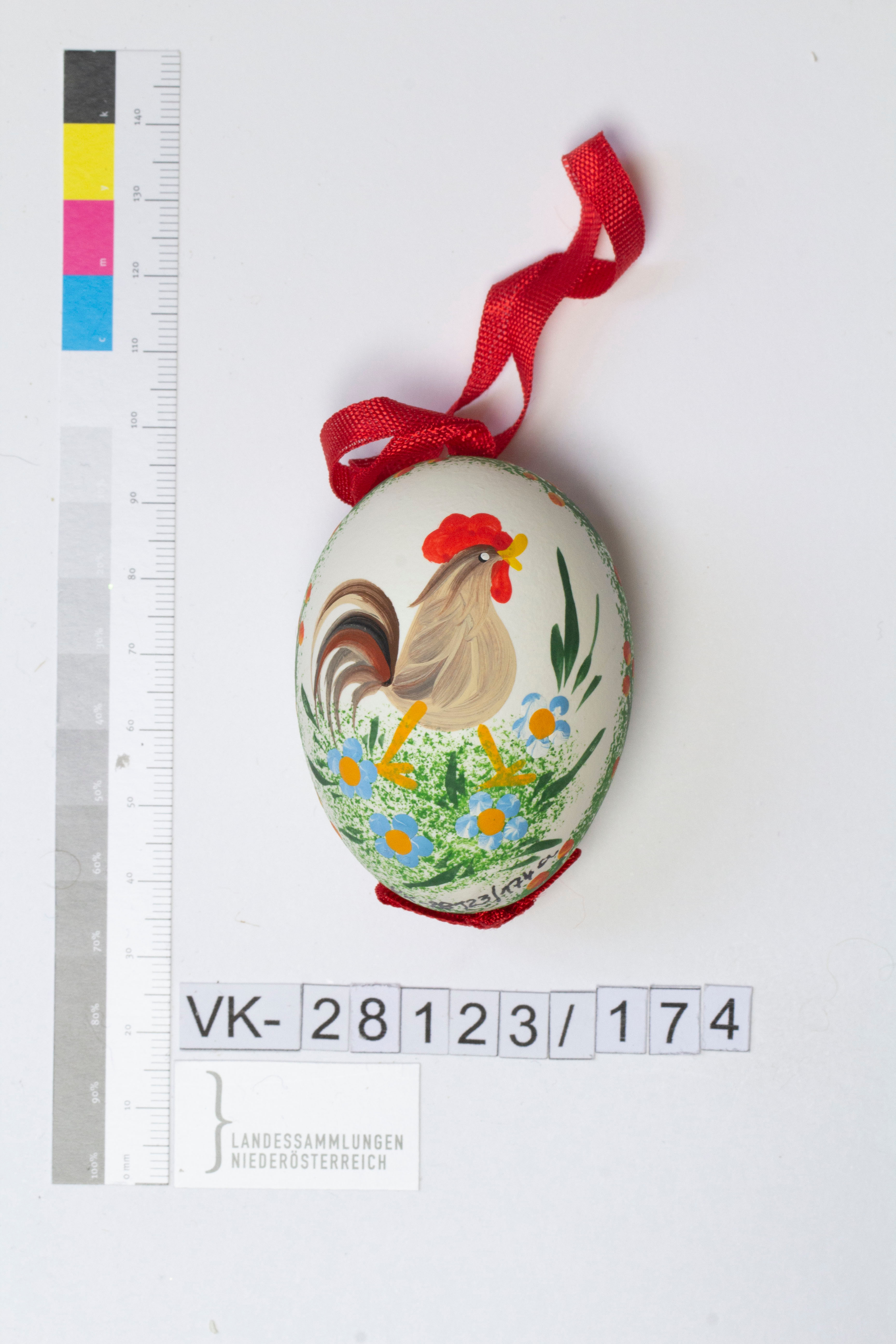 a: Hühnerei, ausgeblasen, bemalt, Musterung: auf weißem Grund Blumen, Hahn, Henne mit Küken, Blumen, Blumenbordüre zwischen Vorderseite und Rückseite, Bändchen: rot, mit Masche fixiert; b und c: runde Spanschachtel, nur Deckel bemalt, Musterung: gleiche Musterung wie auf der Vorderseite des Hühnereies (Hahn und Blumen)