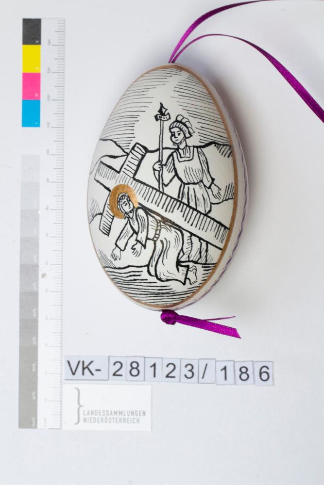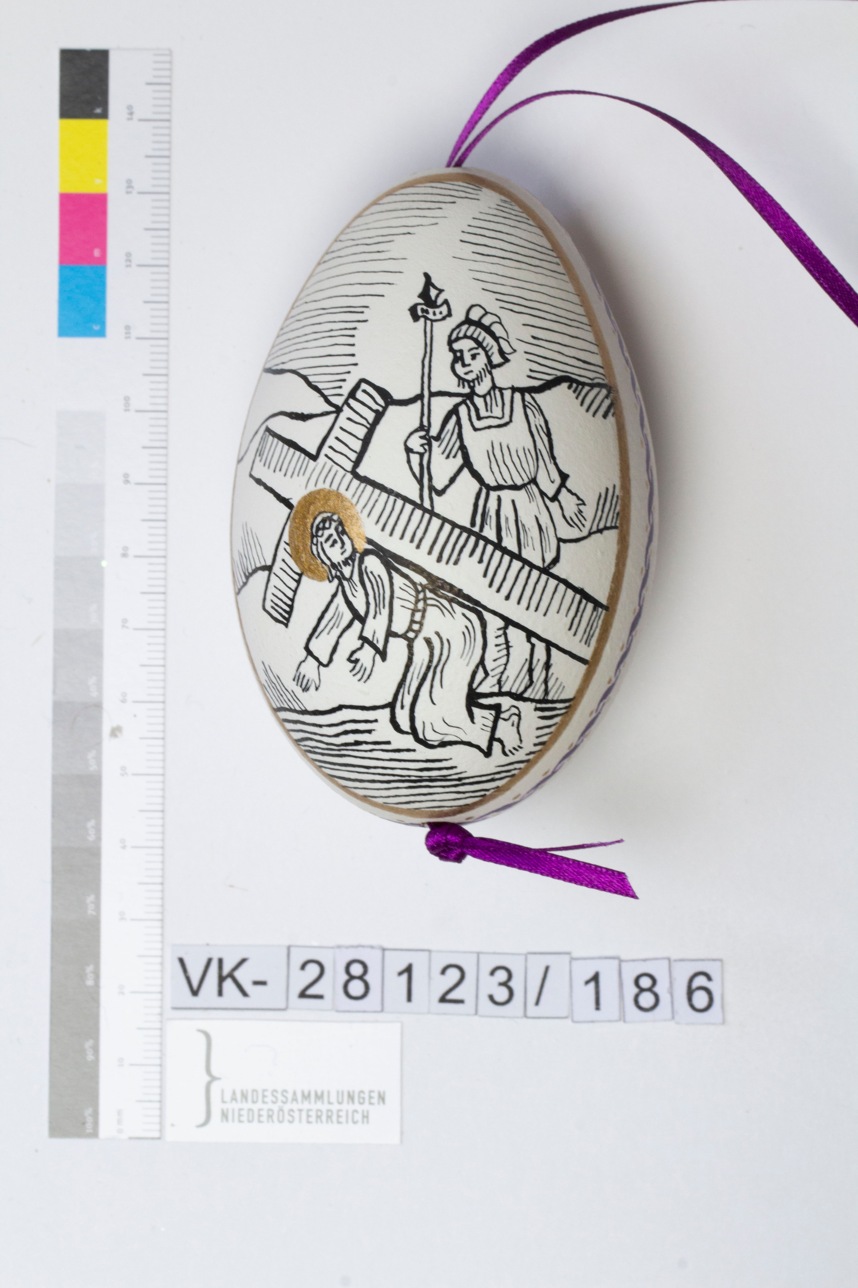 Gänseei, ausgeblasen, naturbelassen weiß, bemalt, Musterung: bemaltmit Tusche: Darstellung (Jesus mit Kreuz und 2 Frauen)und Spruch zum Kreuzweg "Station VIII/ Jesus begegnet den weinenden Frauen von Jerusalem"; bemaltin gold und lila: Bordüre zwischen Vorderseite und Rückseite; Bändchen: violett, mit Knoten fixiert