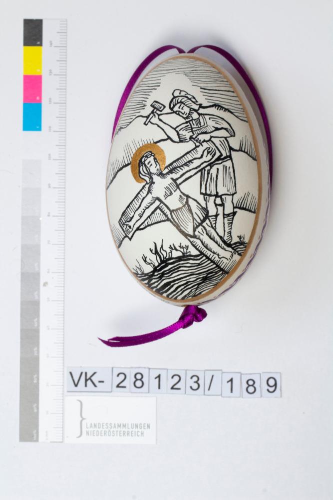 Gänseei, ausgeblasen, naturbelassen weiß, bemalt, Musterung: bemaltmit Tusche: Darstellung (Jesus am Kreuz und Soldat)und Spruch zum Kreuzweg "Station XI/ Jesus wird ans Kreuz genagelt"; bemaltin gold und lila: Bordüre zwischen Vorderseite und Rückseite; Bändchen: violett, mit Knoten fixiert