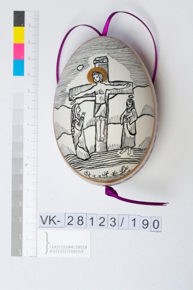 Gänseei, ausgeblasen, naturbelassen weiß, bemalt, Musterung: bemaltmit Tusche: Darstellung (Jesus am Kreuz, Maria und Simon?)und Spruch zum Kreuzweg "Station XII/ Jesus stirbt am Kreuz"; bemaltin gold und lila: Bordüre zwischen Vorderseite und Rückseite; Bändchen: violett, mit Knoten fixiert