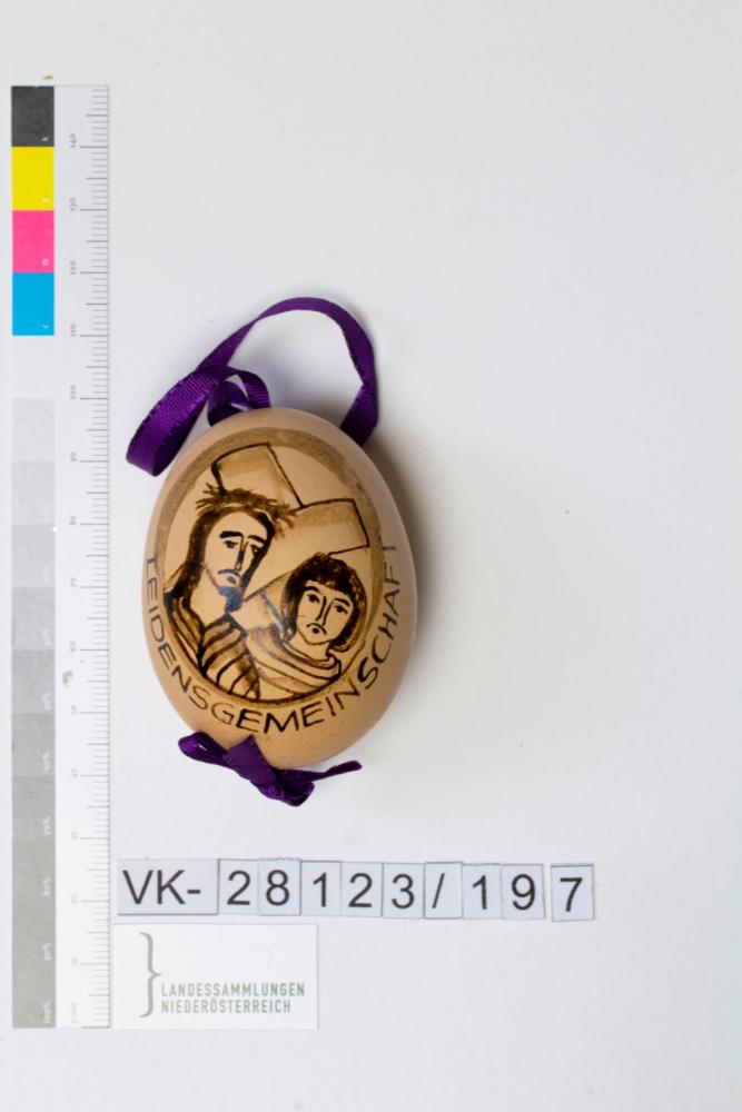 Hühnerei, ausgeblasen, naturbelassen braun, bemalt, Musterung: bemaltmit Tusche: Darstellung (Jesus, Kreuz, Simon) mit persönlicher Bezeichnung "Leidensgemeinschaft" und Spruch zum Kreuzweg "Station V/ Simon von Cyrene hilft Jesus das Kreuz tragen"; Bändchen: violett, mit Masche fixiert