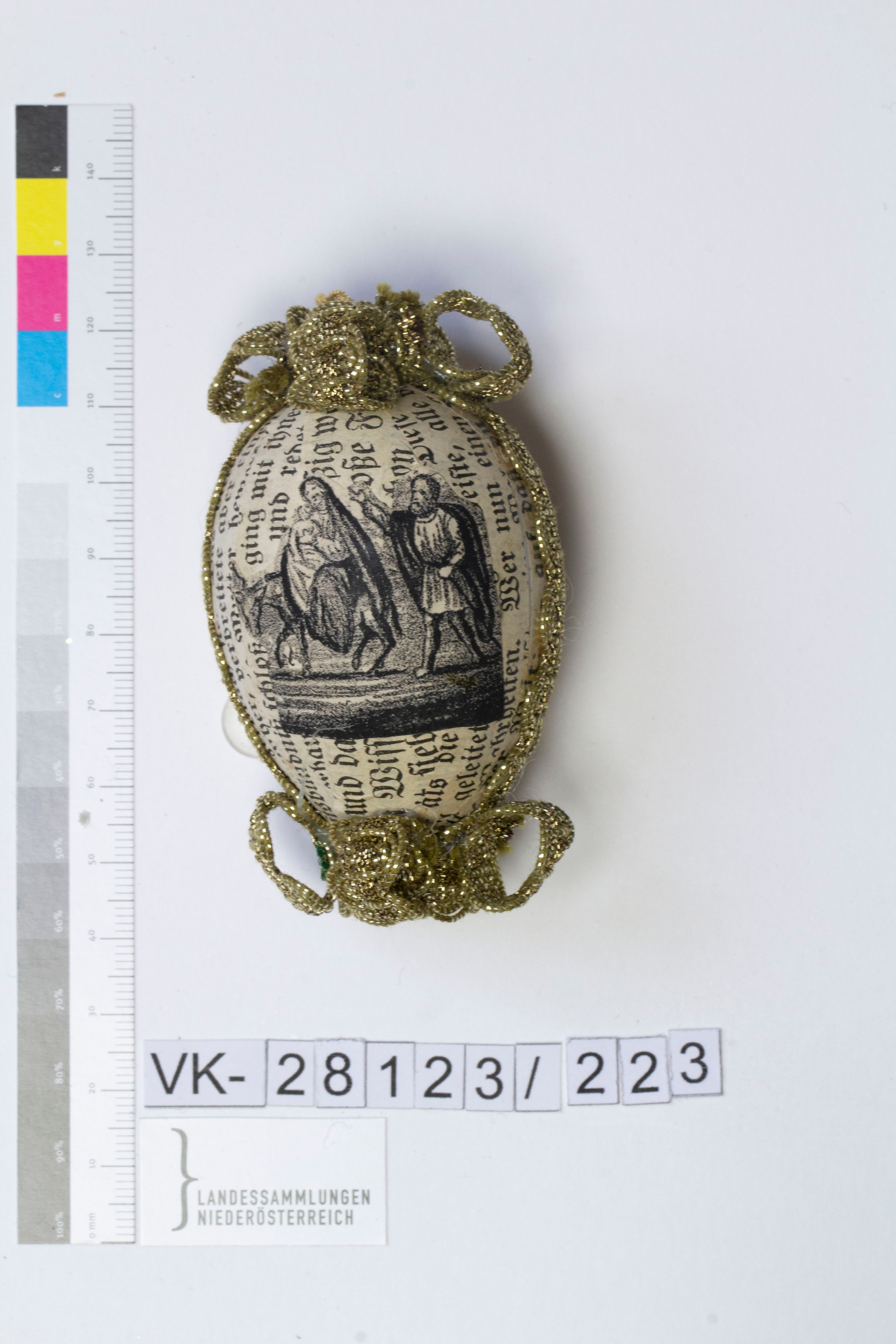 Kunststoffei, umwickelt mit Papierstreifen, bedruckt mit religiösen Texten und Darstellungen (Flucht nach Ägypten, Engel); Goldborte zwischen Vorderseite und Rückseite verklebt, an den Enden des Eies mit zu Schlaufen gelegten Goldborten verziert; Bändchen: Goldschnürchen