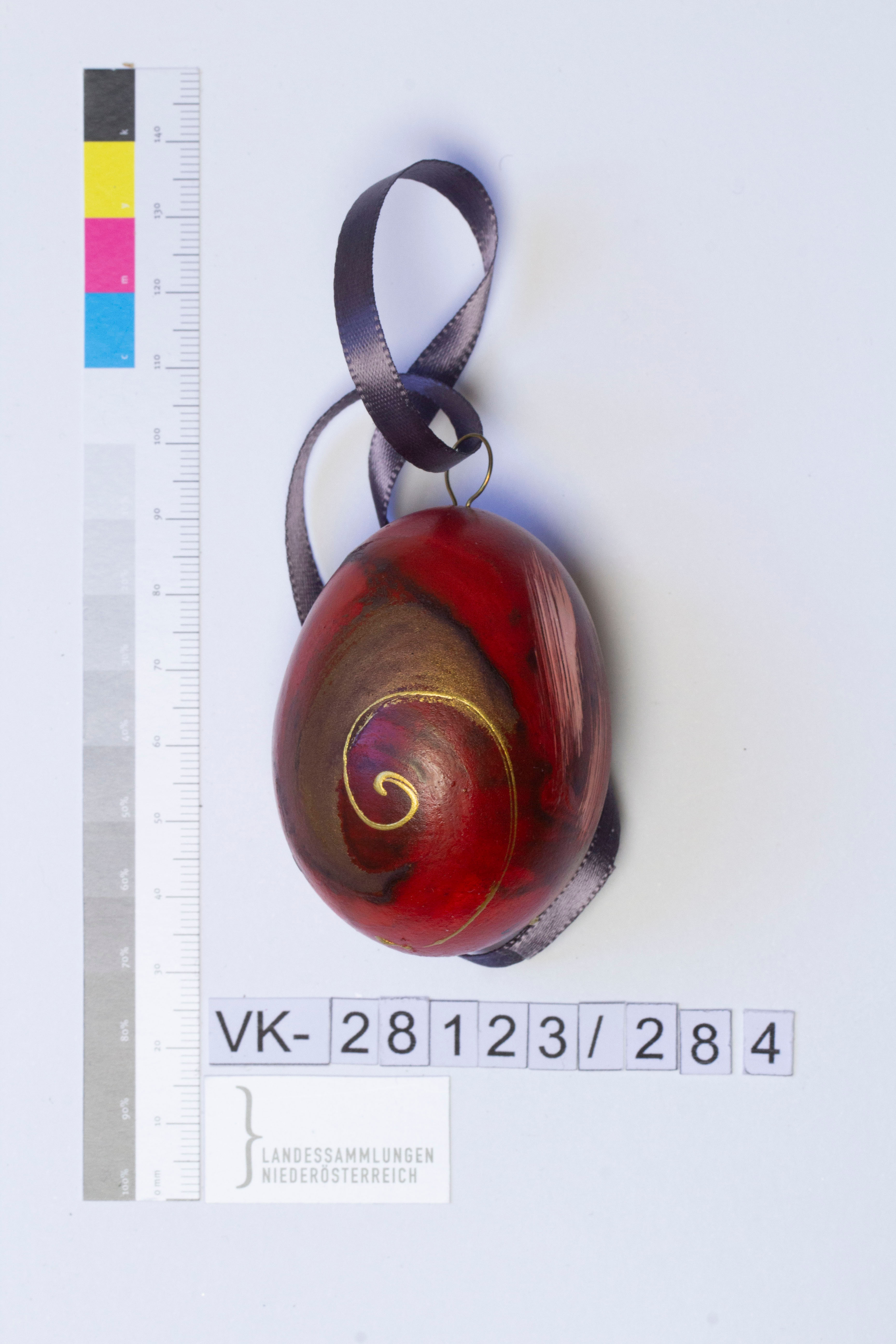 Hühnerei, ausgeblasen, bemalt, Musterung: abstrakt mit dreidimensionalen Effekten = Applikation? in rot, schwarz, weiß, gold; Bändchen: grau, mit Öse aus Draht fixiert