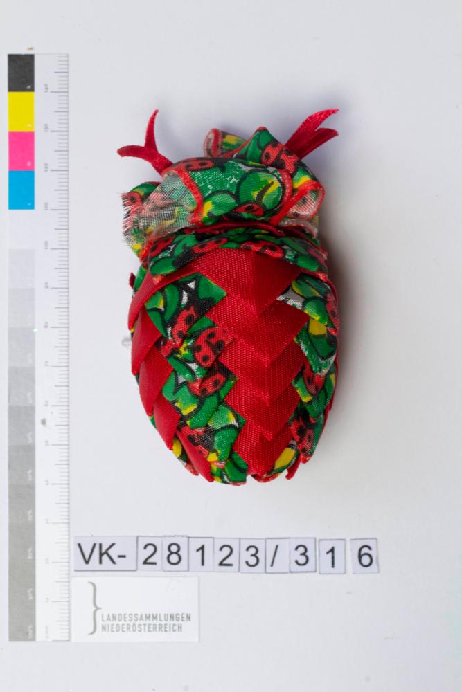 Kunststoffei (Styropor), umwickelt mit zu Spitzen gefalteten Stoffen: alternierend einfärbig rot und bedruckt mit Marienkäfern und Blättern - diese Spitzen wurden mit Stecknadeln fixiert; üppige Masche aus Stoff mit Marienkäfern verklebt; Bändchen: rot, verklebt