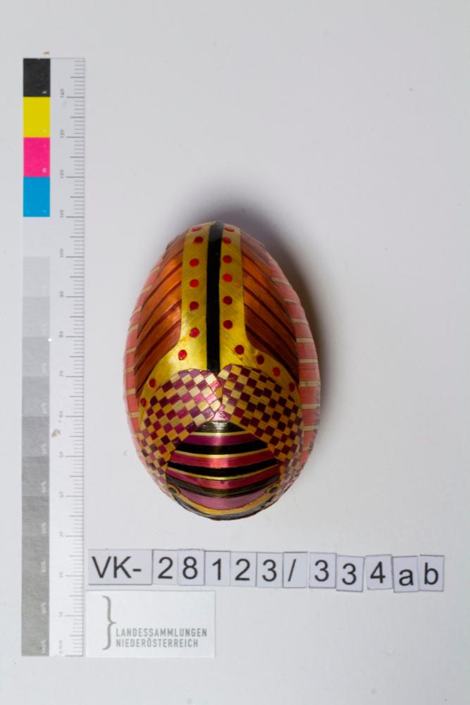 Kunststoffei mit Standfläche, Musterung: intarsiert mit buntem Stroh, geometrische Motive; beide Schalen-Innenseiten mit grünem Stoff ausgelegt (Stoff in Falten gelegt und verklebt)