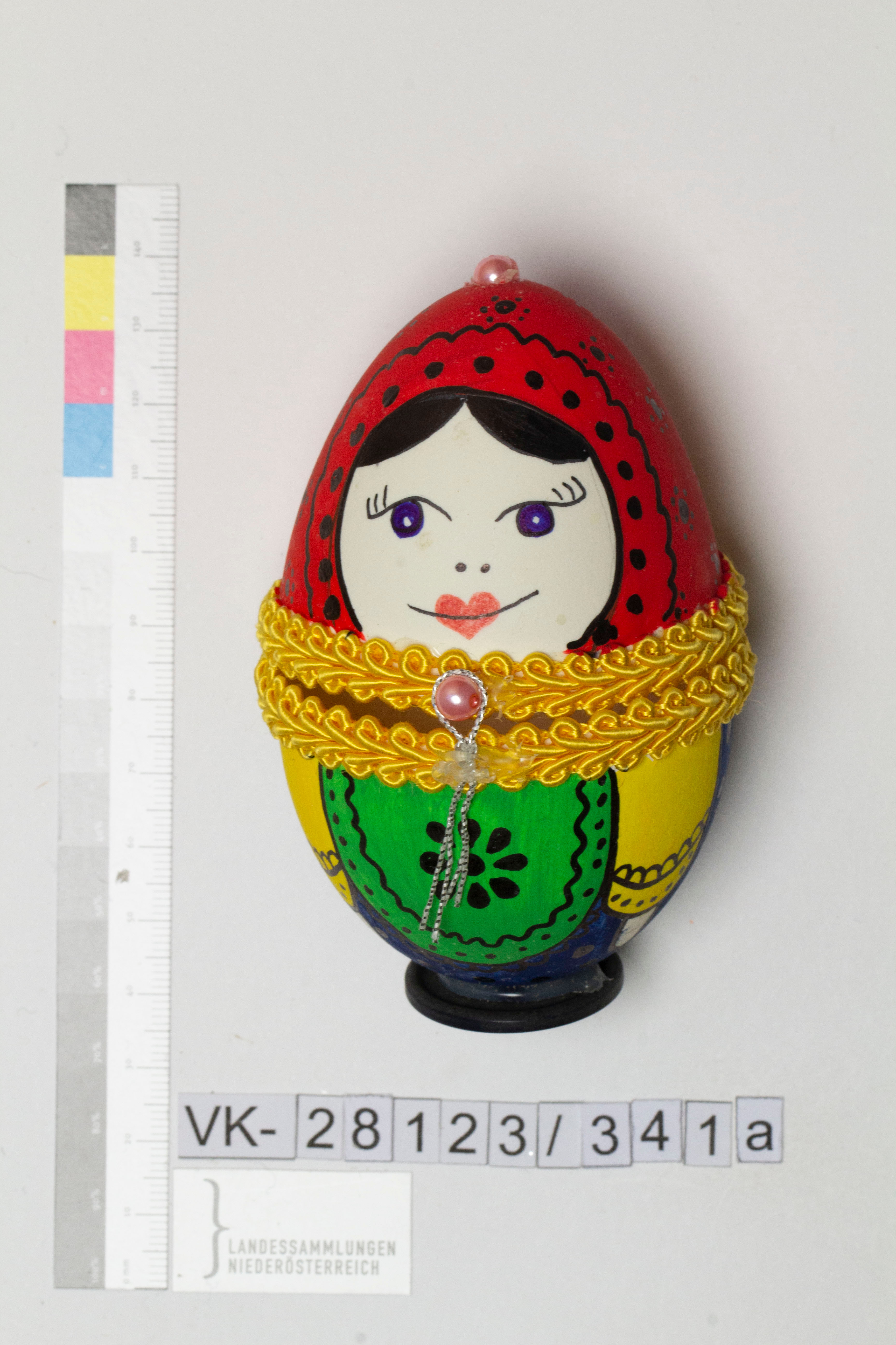 Entenei mit Standfläche = Babuschka -Ei, 4 teilig, ausgeblasen, aufklappbar, bemalt, Musterung: typische Bemalung der ineinandergesetzten Babuschka-Puppen, Perle mit Schlaufe als Verschluss, Loch zum Ausblasen des Eies mit Perle verschlossen, Standfläche aus Kunststoff schwarz, Borte als Verzierung der Ränder der beiden Eihälften
