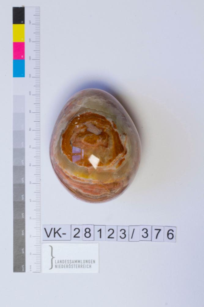 Steinei = Onyx, Musterung: Marmorierung des Steines in braun, grün, gelb