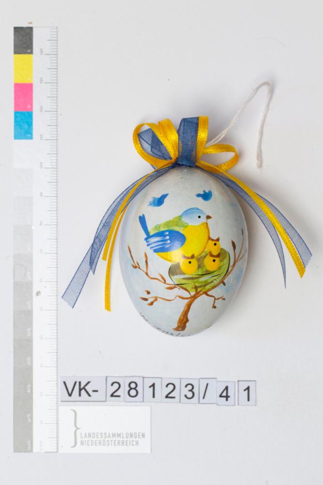 Hühnerei, ausgeblasen, bemalt, Musterung: auf weiß/blauem Hintergrund (leicht marmoriert) Zweig mit Vogelnest mit Vogelweibchen und 3 jungen Vögeln; Baum darüber 2 fliegende Vögel; Bändchen: in blau und gelb, mit Masche und Kleber fixiert